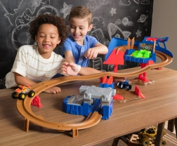 Efter en runde vender køretøjerne tilbage til start, så legen aldrig stopper. Sættet kan desuden hurtigt samles og lægges væk.