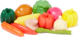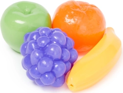 Plastfrugter og -grøntsager suppleret med miniatureæsker og konserves dåser ligner de ægte varer. Børn genkender let banan, druer, majs, peberfrugt eller champignon og lærer navnene på almindelige fødevarer.