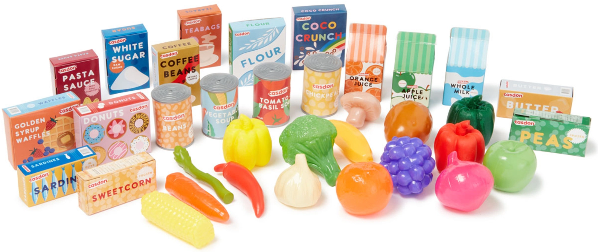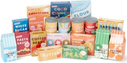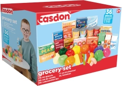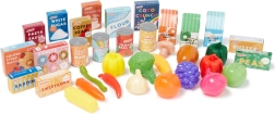 Med dette veludstyrede sæt får børn timer med fantasifuld leg. Det indeholder plastfrugter og -grøntsager (fx banan, druer, majs, peberfrugt, løg, hvidløg og champignon) samt minibeholdere med almindelige fødevarer (mel, sukker, kaffe, mælk, ærter, bønner, sardiner) og drikkevarer eller supper. Realistiske former, farver og tryk understøtter læring gennem leg.