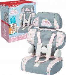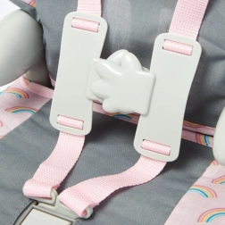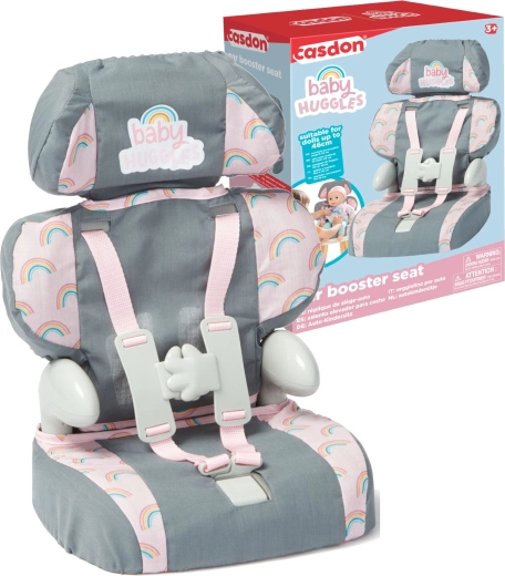 En stilfuld autostol til dukker op til 46 cm fra BABY HUGGLES imponerer med blød polstring, fempunkts sele og stabil, let konstruktion. Det grå‑rosa design med regnbuemotiv understøtter realistisk rolleleg i omsorg og sikker dukkekørsel.