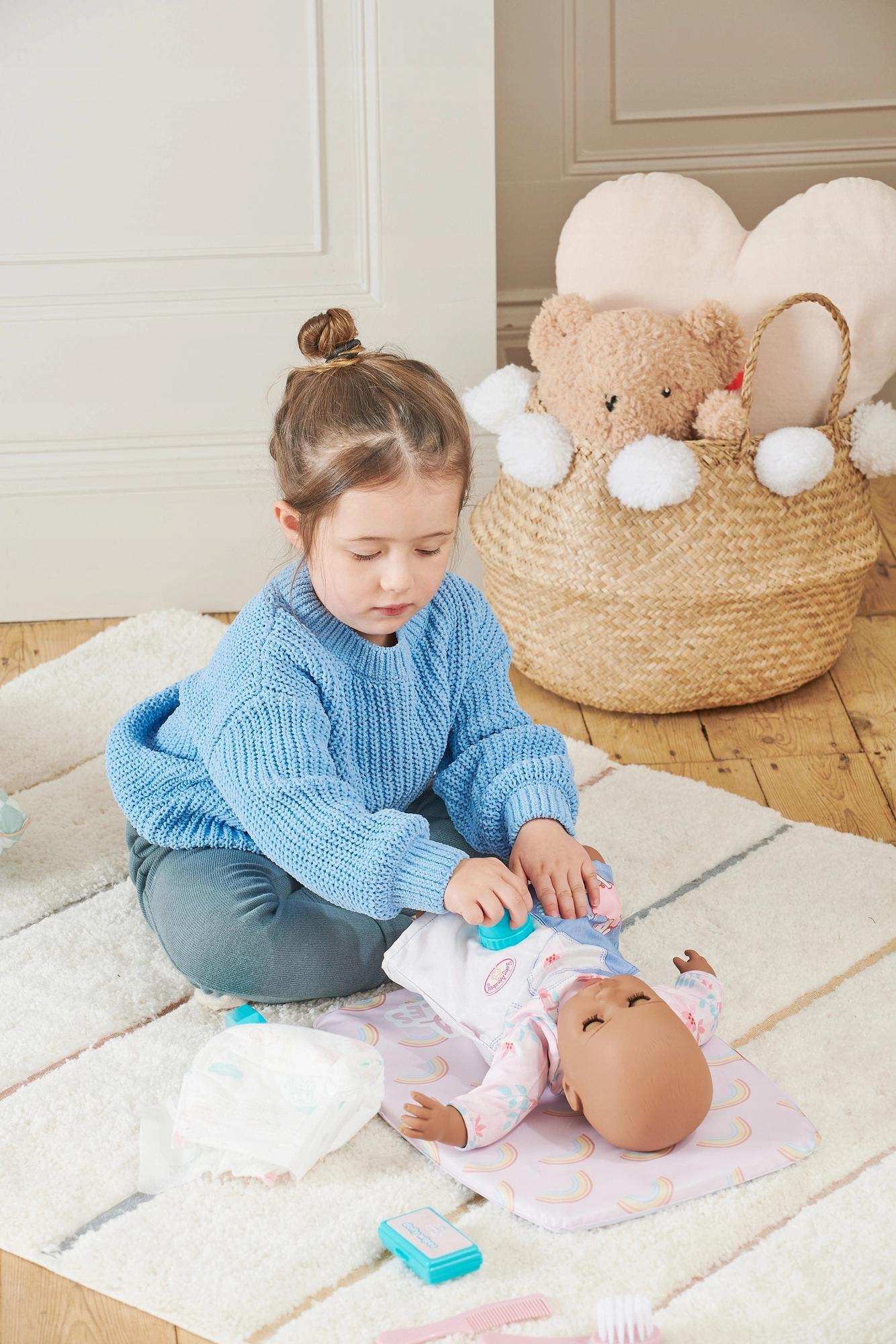 Dette puslesæt til dukker er ideelt til små omsorgspersoner. Børn kan prøve hele plejeritualet – fra at skifte ble til at rede hår og “behandle” babyen. Realistisk udformet tilbehør og den bløde måtte sikrer behagelig og fantasifuld leg, som udvikler finmotorik og empati.