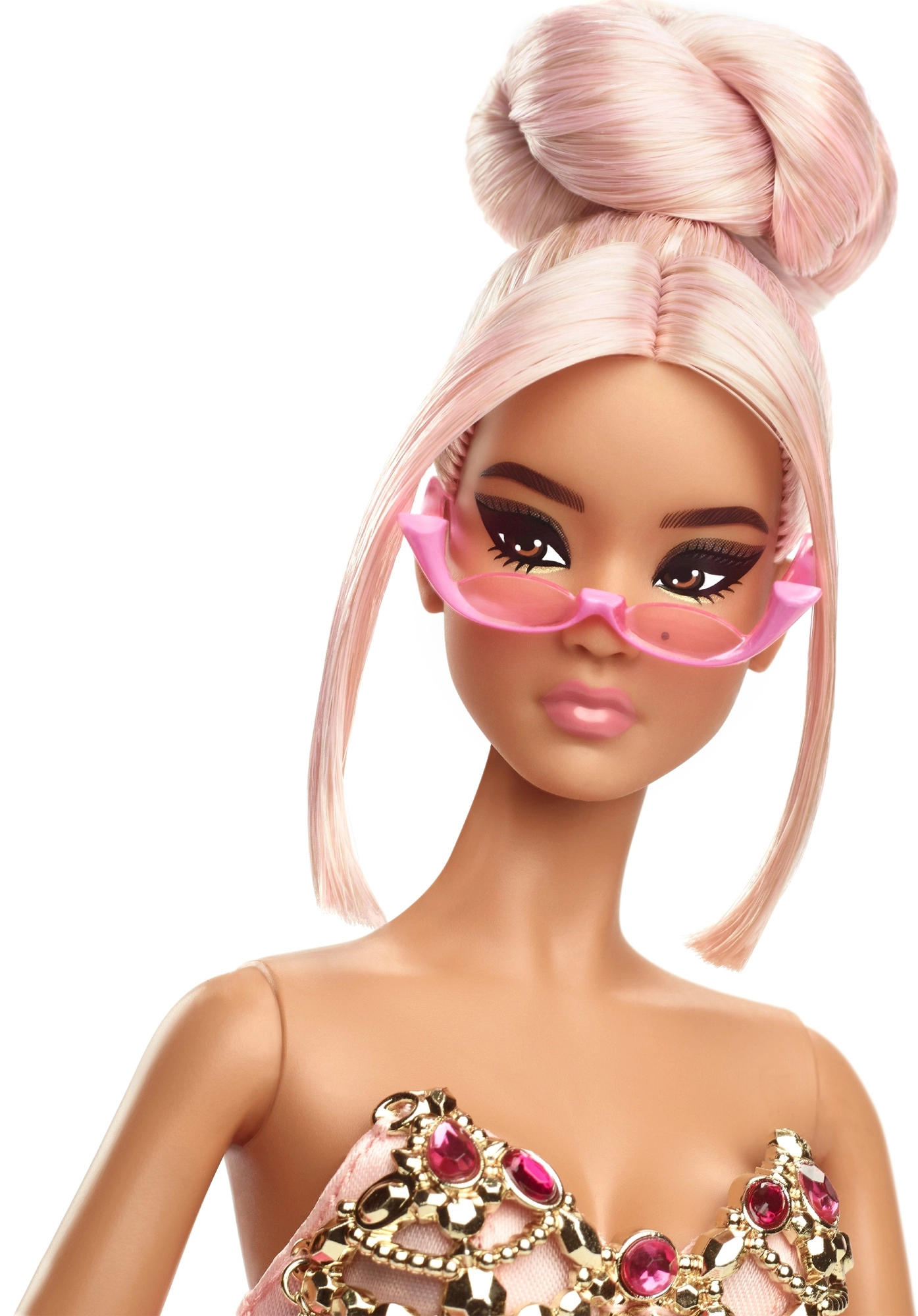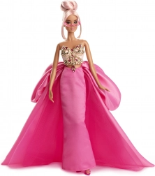 Oplev elegance ved første øjekast: en strålende pink aftenkjole med rigt slæb, en stensat korsage i gyldent toneleje og moderne styling med pink briller giver dukken et ikonisk udtryk. Præcis makeup, gennemarbejdede accessories og mulighed for posering fremhæver hver eneste modedetalje.