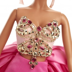 En rigt dekoreret gylden livstykke med pink krystaller og kæder giver dukken et eksklusivt look, perfekt til vitrinen.