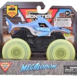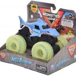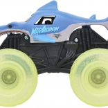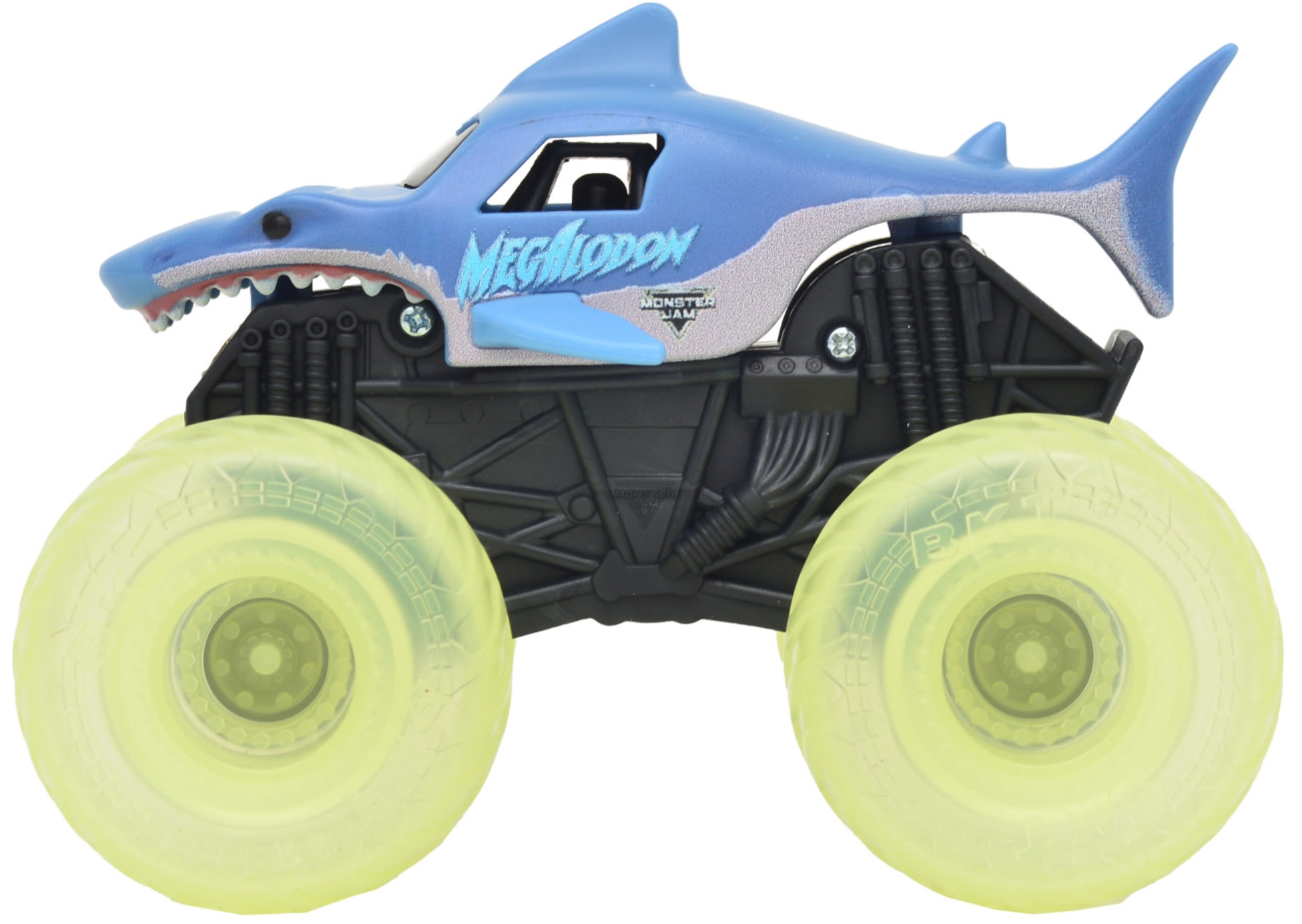 Den populære Megalodon, inspireret af den forhistoriske haj, imponerer med realistiske karrosseridetaljer i blå-grå nuancer, finner og tænder, som understreger det rå look. De store, gennemsigtigt farvede hjul og det robuste chassis er ideelle til stunts både derhjemme og på farten.