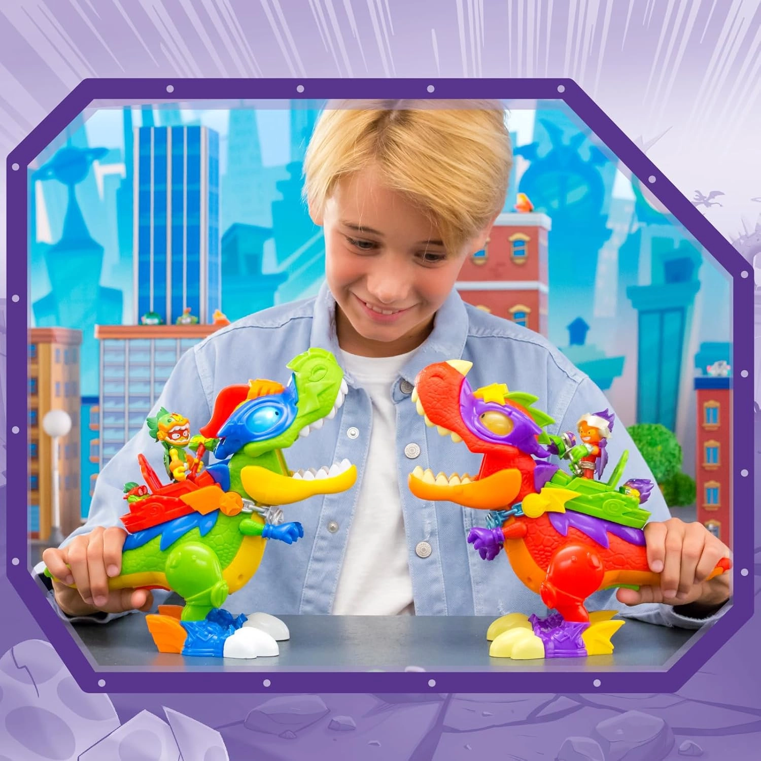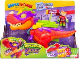 V‑Rex Superdino er allieret med skurkene fra SUPERTHINGS-universet og et fremragende valg for små actionfans og samlere. Takket være den multileddede konstruktion kan du nemt skabe dynamiske poser, mens lys og brøl giver kampene den rette atmosfære.