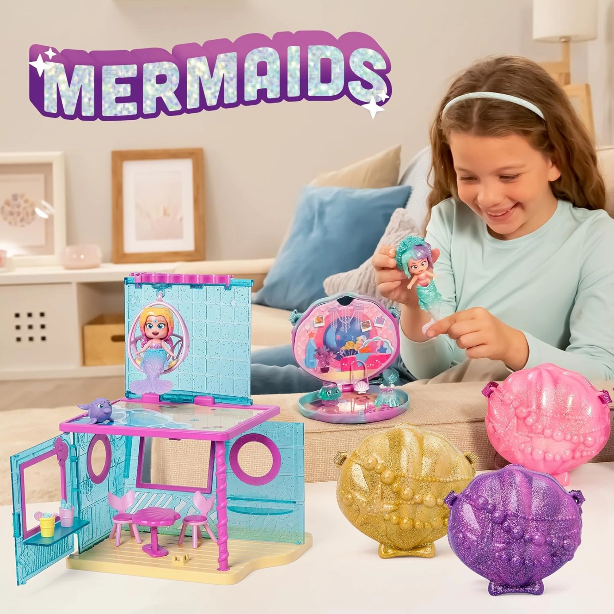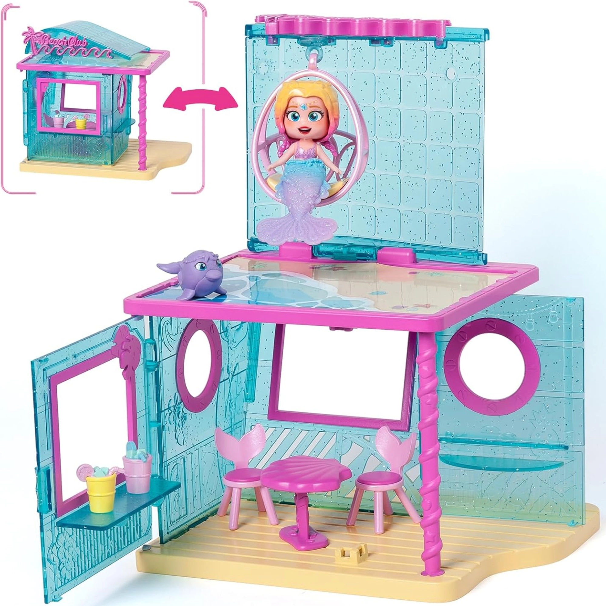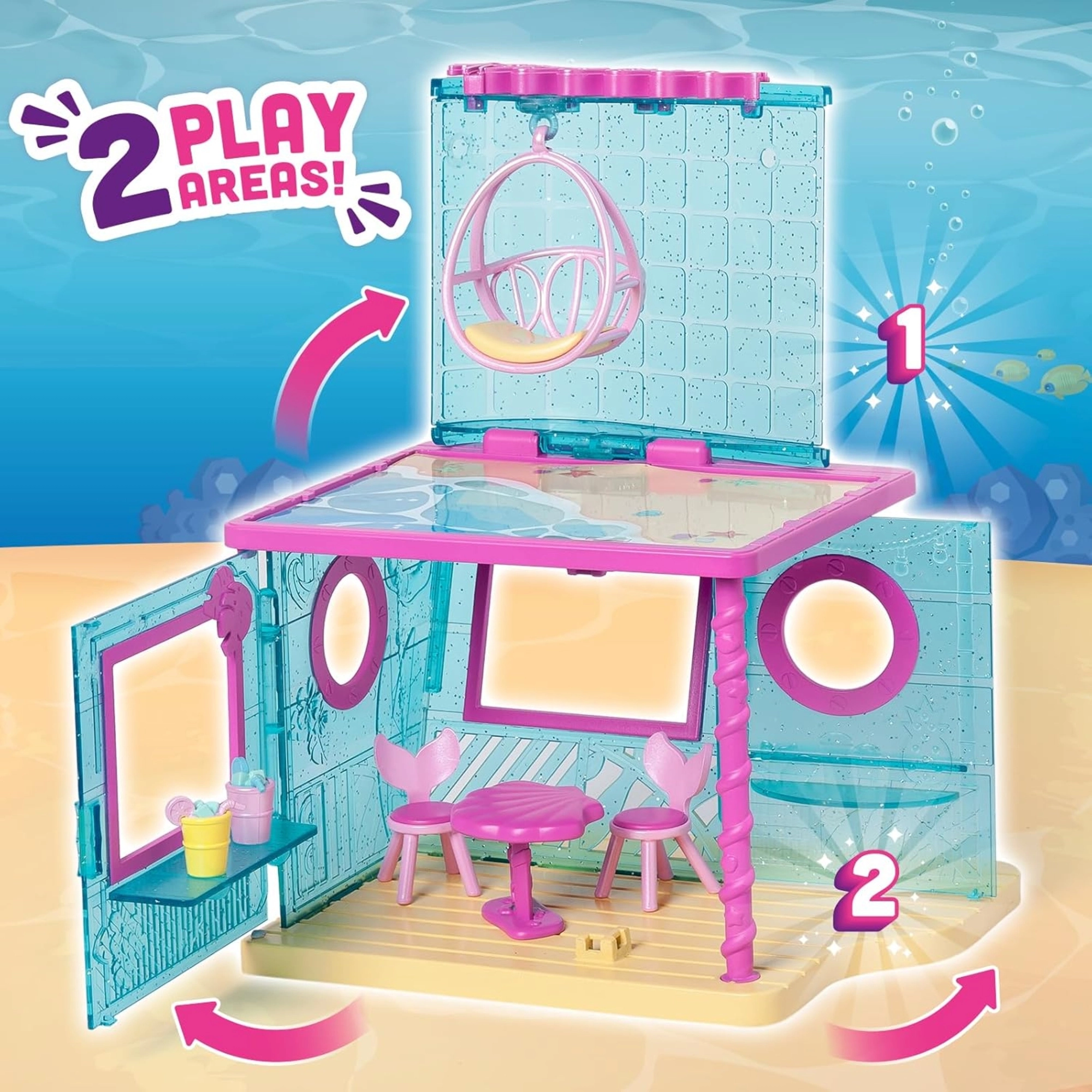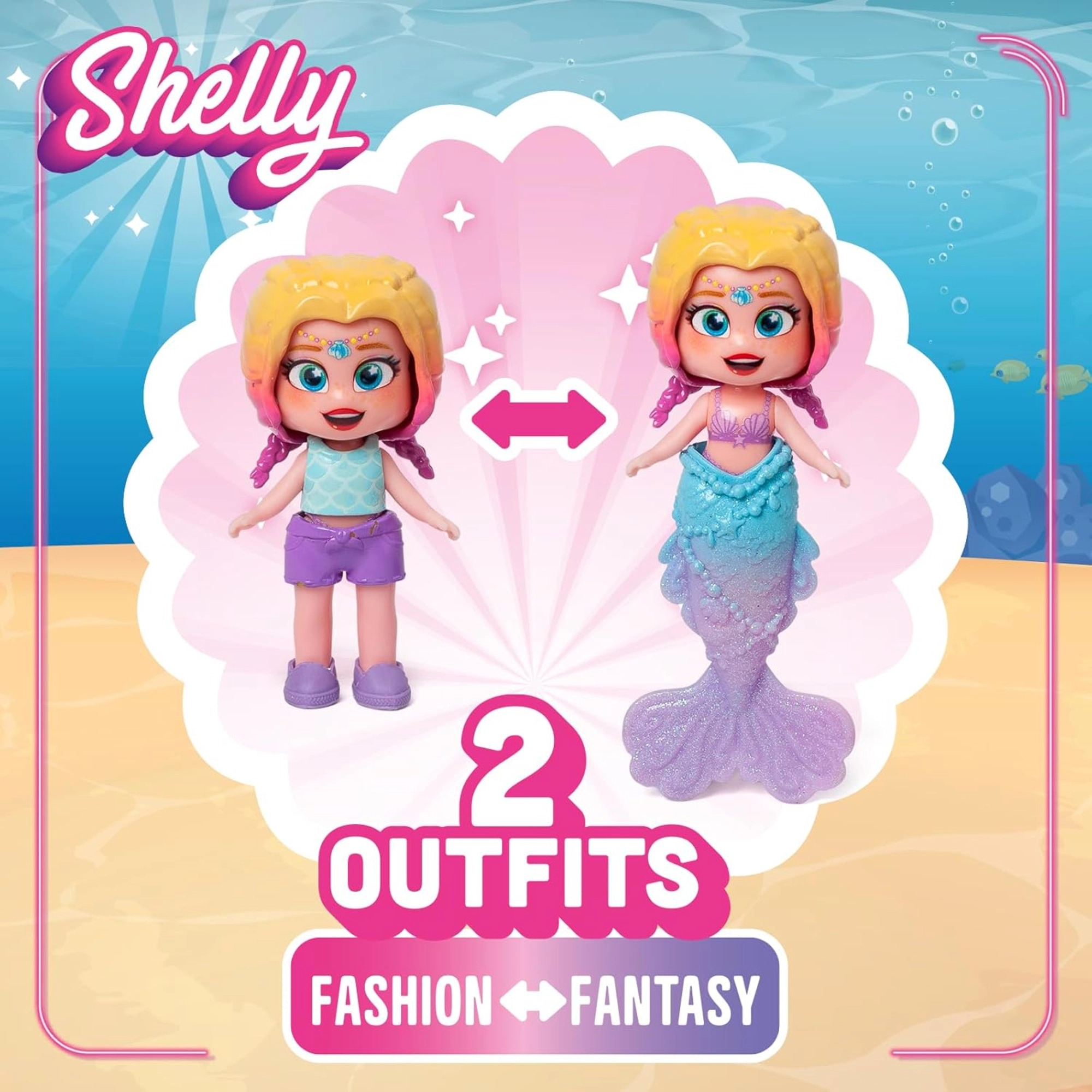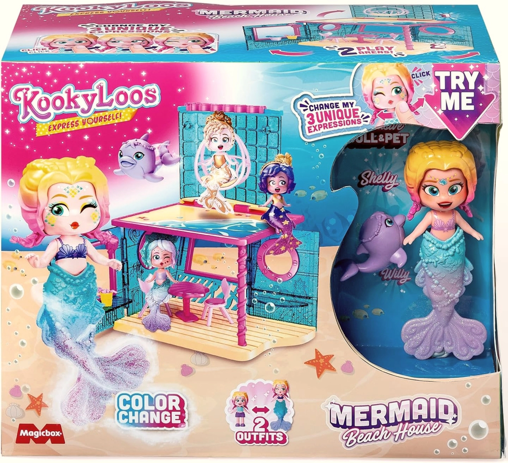 Træd ind i undervandsuniverset med KookyLoos MERMAID – den søde havfrue Shelly med bevægelige led, 3 ansigtsudtryk og en iøjnefaldende glitrende hale. Åbn strandhuset til havfruer, pynt det som du vil, og nyd endeløse historier med den trofaste ven – den lille delfin.