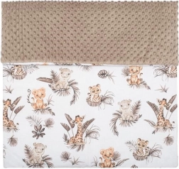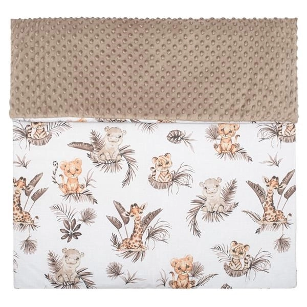 Det vendbare Safari-tæppe giver børn komfort og sansemæssig stimulering. Den ene side er i blød minky med 3D-prikker til mild senso-motorisk stimulering, den anden i 100% bomuld med originale motiver, som udvikler fantasi samt forståelse for farver og former. Med det antiallergiske fyld er tæppet ekstra blødt, varmere og egnet til helårsbrug.