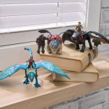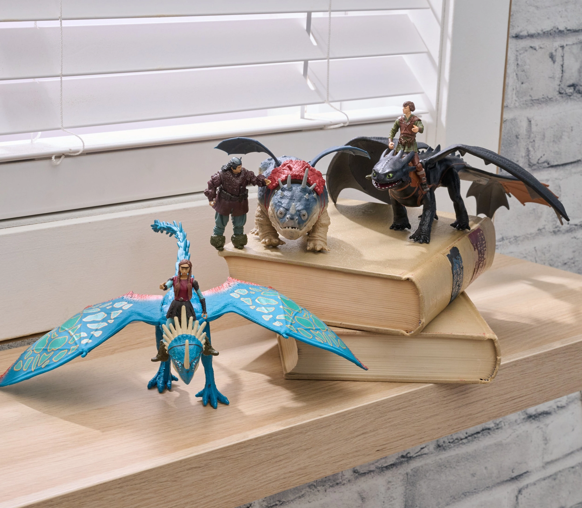 - Dragon & Viking Rider-duo: Astrid (ca. 7,5–7,6 cm) fastgøres til dragen (ca. 25 cm) med solide holdere i sadlen.