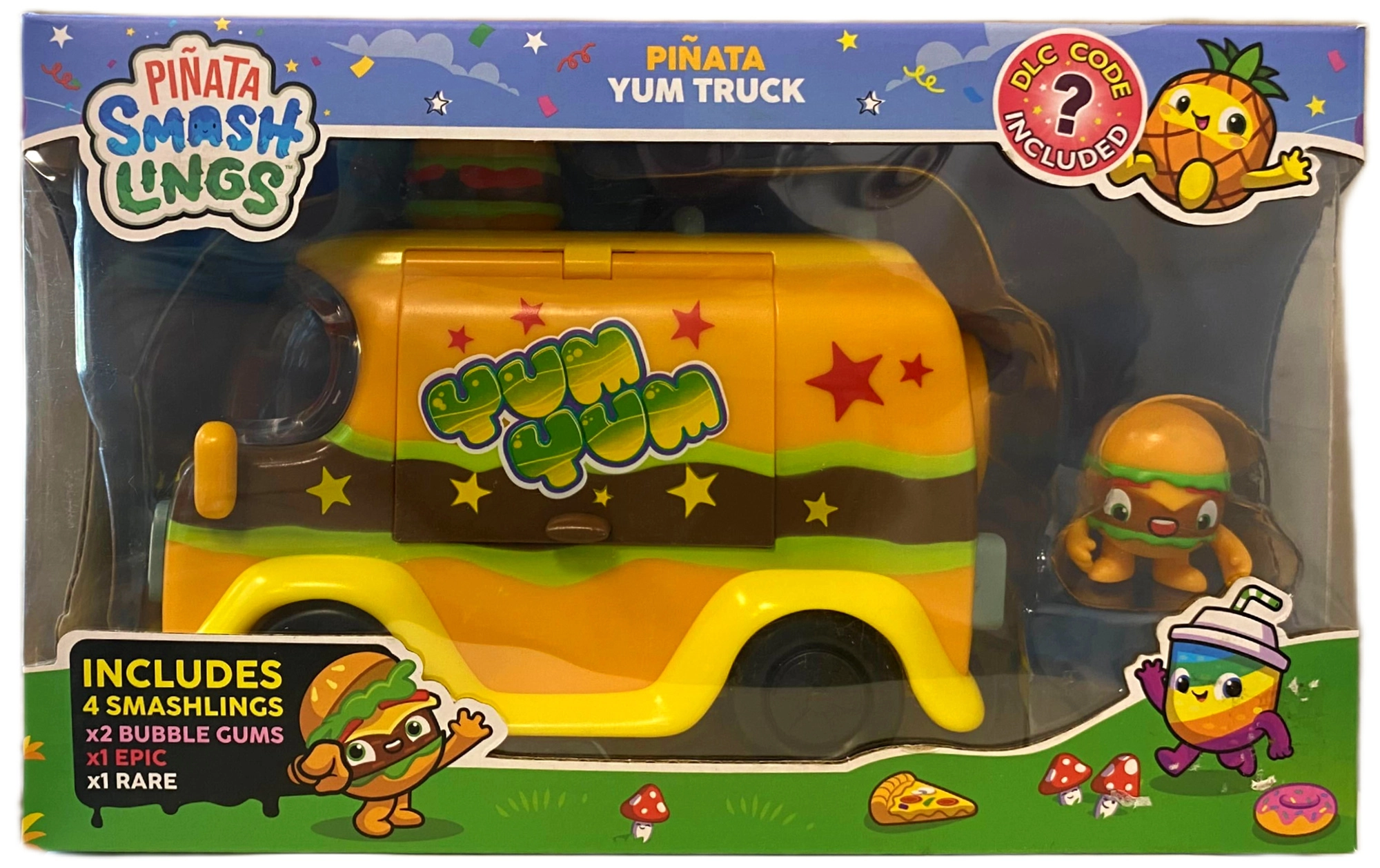 Opdag en tropisk verden af søde sager, hvor søde og energiske Smashlings vækkes til live fra regnbuefarvede piñataer. Det officielle Yum Truck Playset byder på en stilfuld foodtruck med åbningsdøre og interiør klar til fest, fire farverige figurer (ca. 3,5–4 cm) og tre “foodie”-tilbehør til servering af lækkerier. Med en DLC-kode låser du desuden op for unikt indhold i spillet.