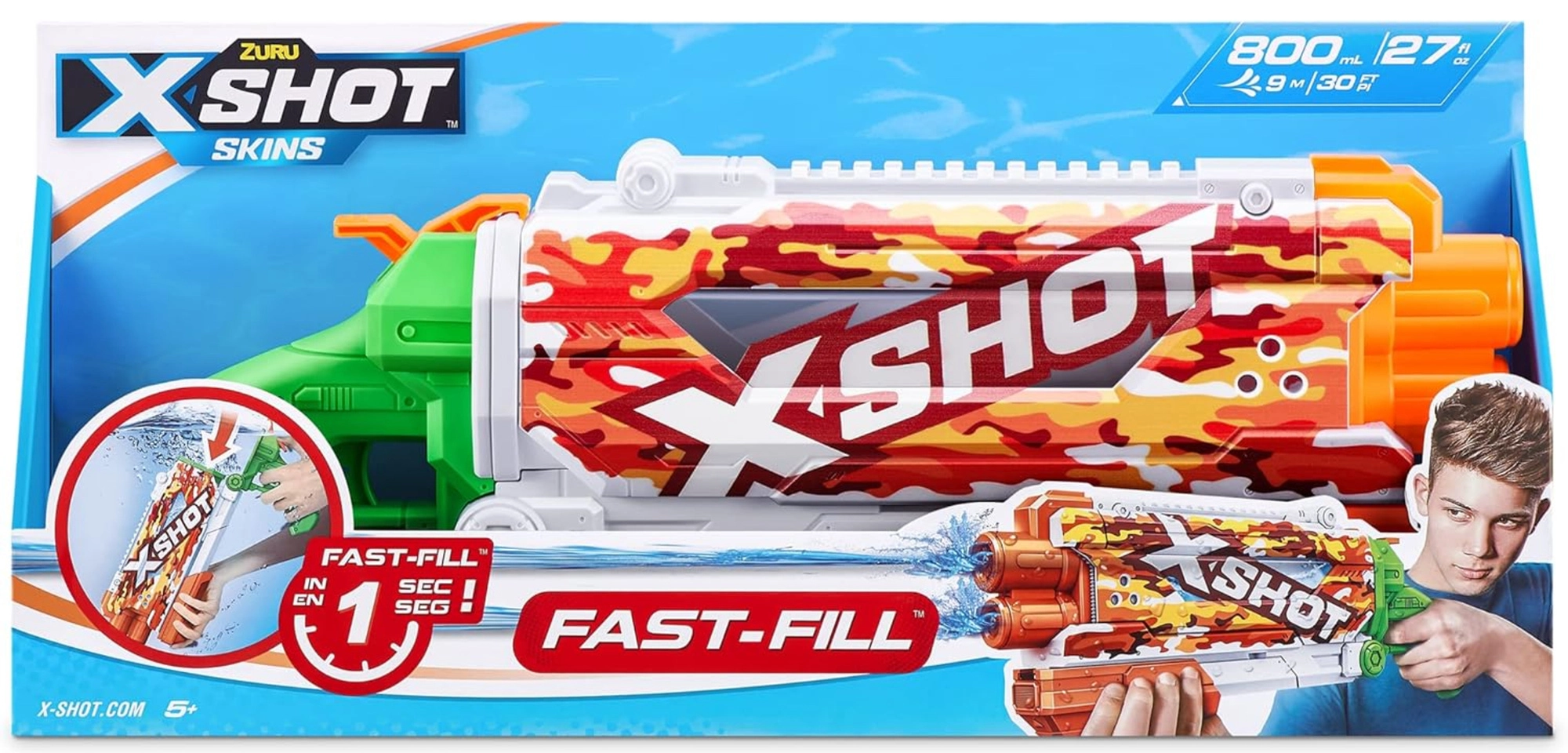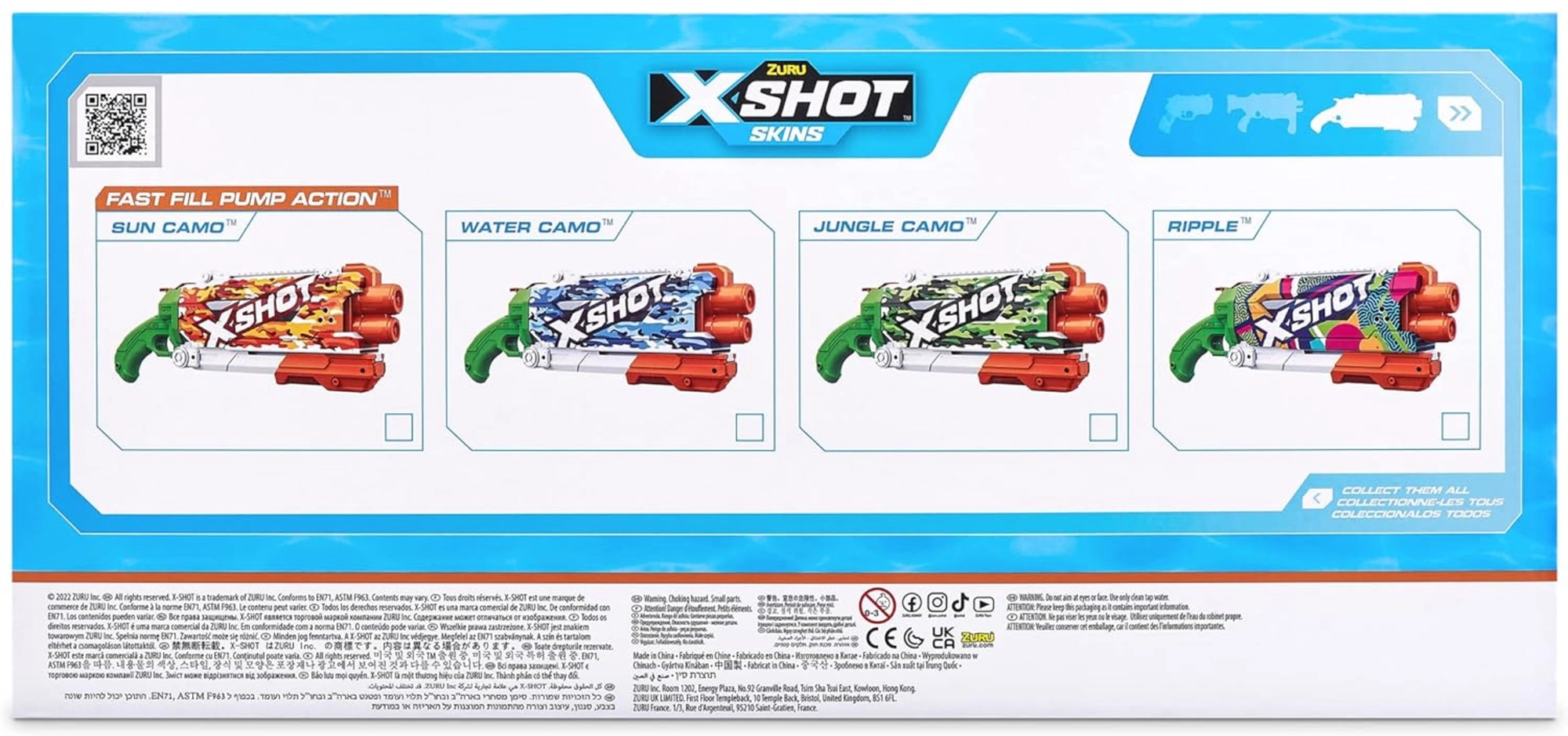Vandpistolen ZURU X SHOT SKINS Fast-Fill Sun Camo giver lynhurtig genopfyldning og en kraftig stråle for maksimal sjov. Det innovative Fast-Fill-system lader dig fylde vand direkte fra vandhane eller spand på ét sekund, så du hurtigt er tilbage i aktionen. Med en rækkevidde på op til 10 m rammer du modstanderen med præcision og power.
