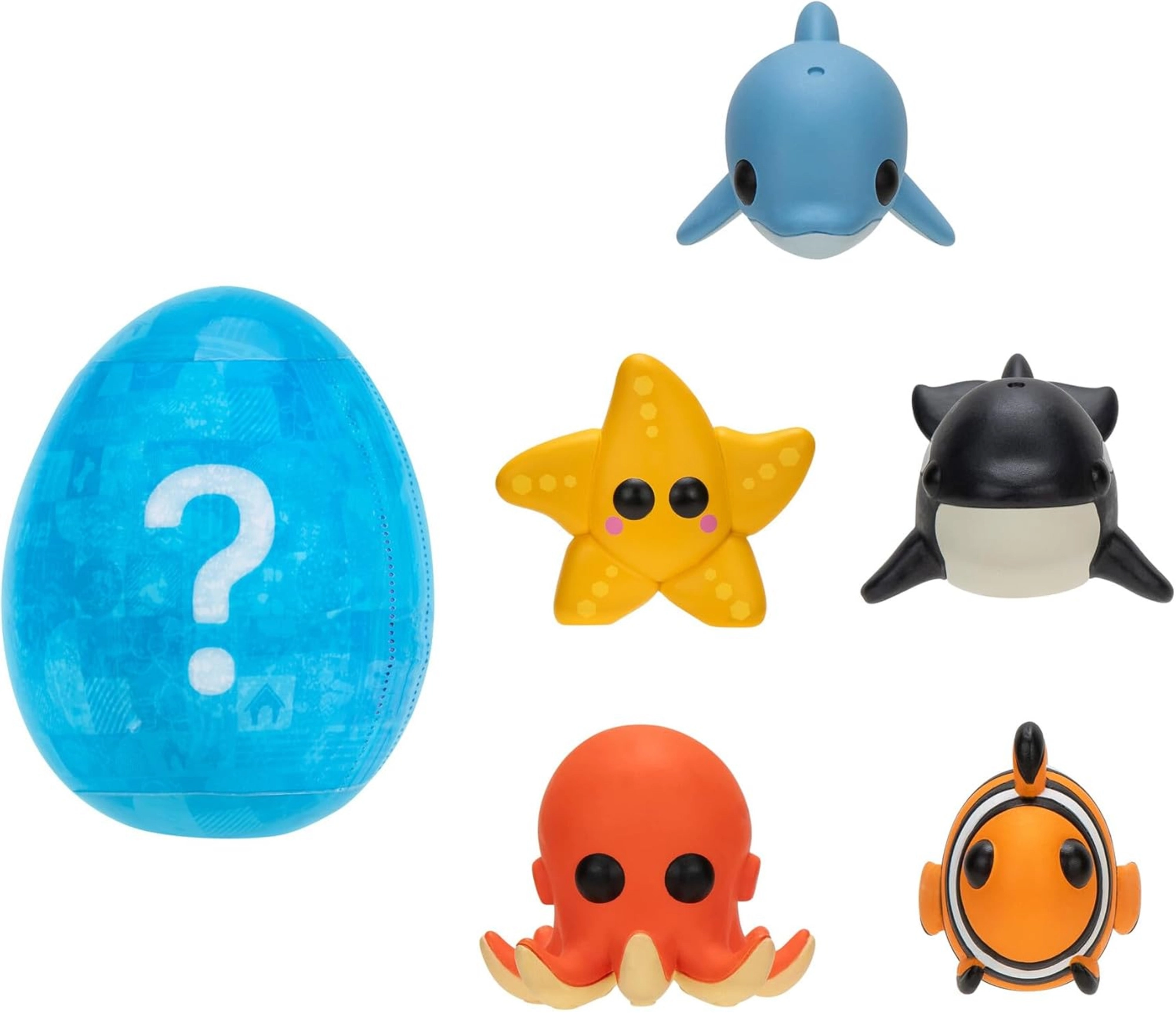 Oplev ADOPT ME-universet i virkeligheden! Dette sæt med 7 stk indeholder 6 havdyr og et mystisk overraskelsesæg, som afsløres, når det sænkes i vand. Glæd dig til farverige samlerfigurer på ca. 3–5 cm, virtuel kode til spillet og masser af sjov for både små fans og samlere.