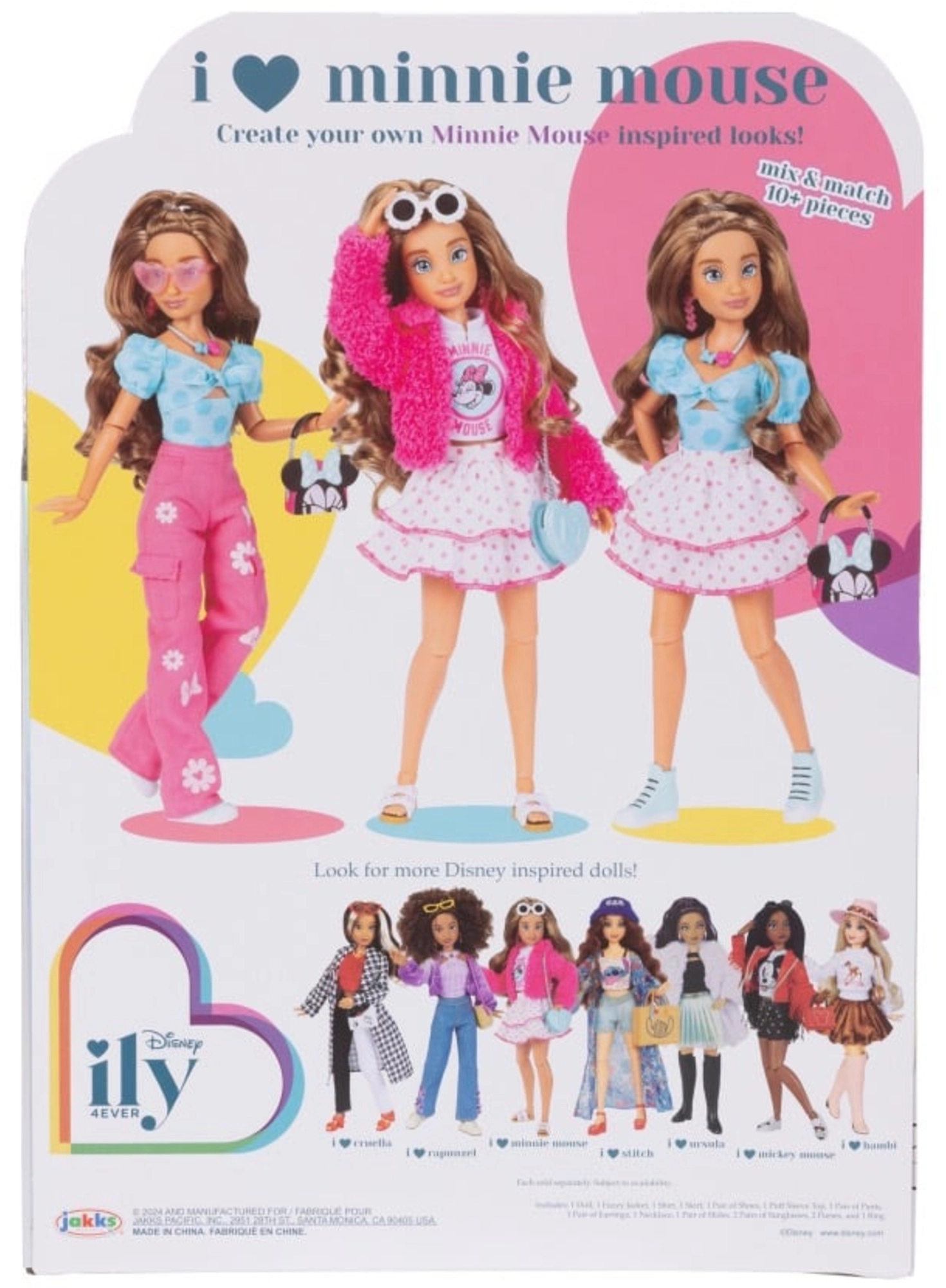 Sættet inkluderer en rosa, fluffy jakke, kjole/nederdel med prikker, top med Minnie-print, rosa cargobukser, blå polkaprikket top, sandaler og sneakers, tasker med Minnie-motiver, solbriller og flere pyntegenstande. Kvalitetsmaterialer og omhyggeligt syet tøj sikrer lang holdbarhed og nem omklædning.