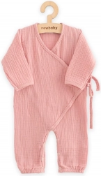Oplev komforten ved musselin heldragten fra New Baby i en blid lyserød farve. Takket være wrap-snittet tages den hurtigt på uden unødvendig aftagning over hovedet. Den praktiske sidelukning med snore, suppleret med en indvendig tryklås, holder dragten på plads. Tryklåsene mellem benene gør bleskift markant lettere både hjemme og på farten.