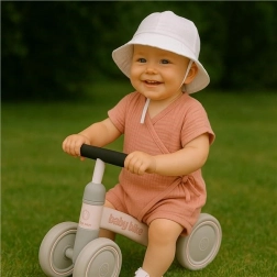 Denne stilfulde sommer-musselin heldragt med korte ærmer er ideel til varme dage. Slå-om lukning i siden med snore og indvendig trykknap gør den let at tage på, mens trykknapper mellem benene gør bleskift hurtigere. Blødt elastiske kanter ved benene trykker ikke og giver maksimal komfort for babyen.