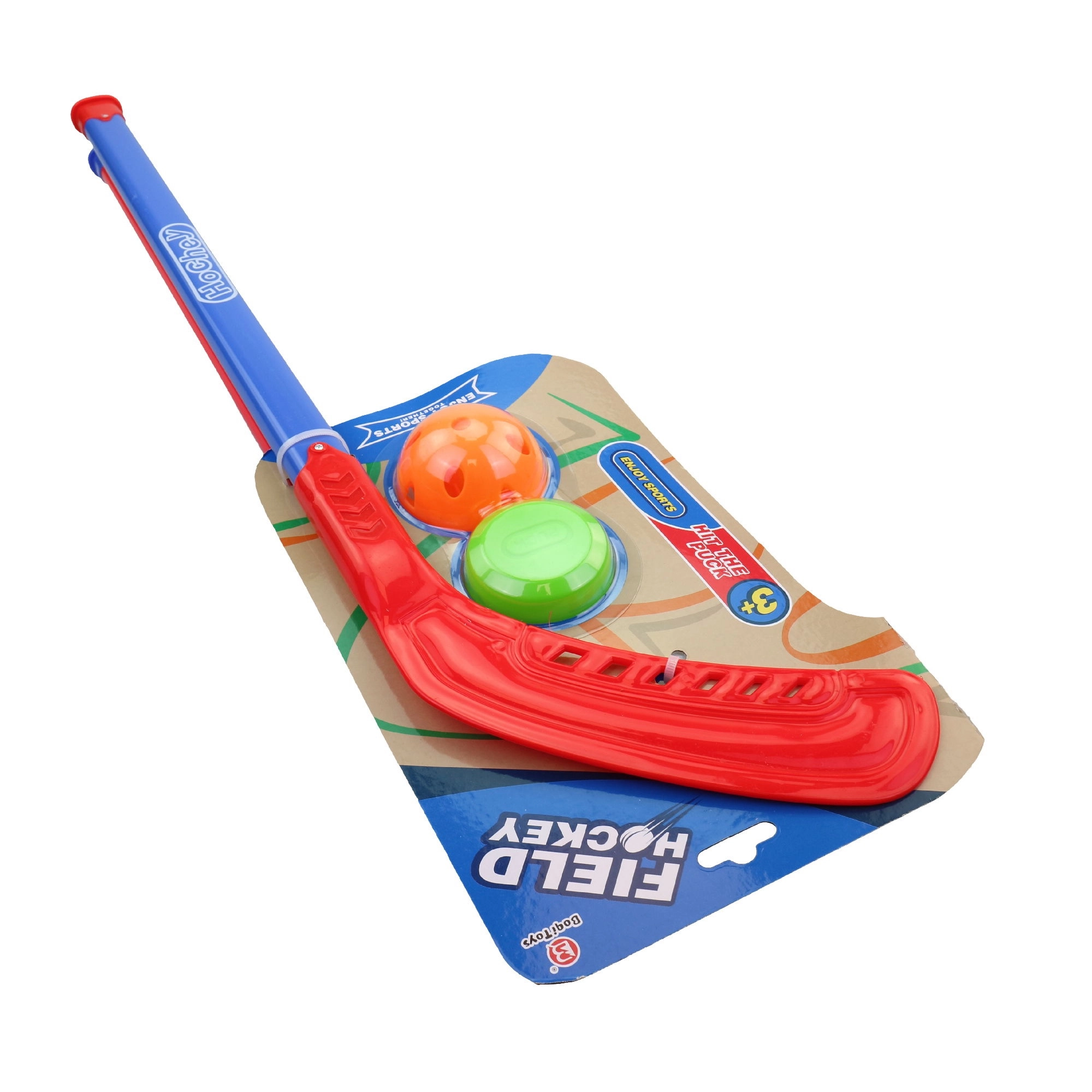 Denne hockeysæt til børn indeholder en stav, en bold og en puck, så de små spillere kan prøve forskellige måder at spille på. Det lette og holdbare plastmateriale er ideelt til de første skridt i hockeyens verden og til sikker leg derhjemme, i haven eller på legepladsen.