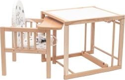 Nemt skift fra høj højstol til separat bord og stol til leg, tegning og selvstændige måltider.