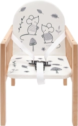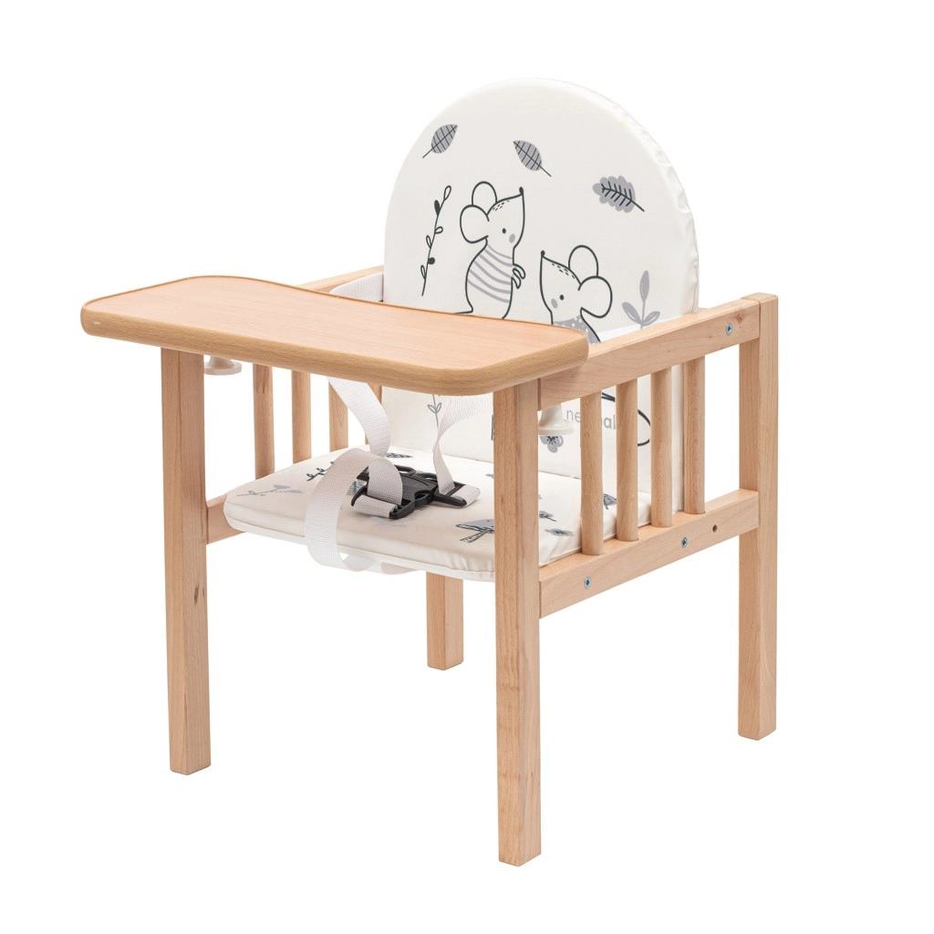 Den træbaserede højstol NEW BABY Jerry kombinerer sikkerhed, komfort og lang holdbarhed. Den er fremstillet af kvalitets bøgetræ, som giver høj stabilitet og modstandsdygtighed i daglig brug. Den bløde polstring med glade motiver og den aftørrelige spisebakke gør vedligeholdelsen let og gør hvert måltid hyggeligt.