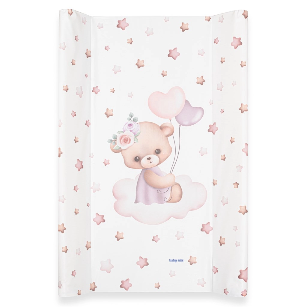 Skifteunderlaget BABY MIX i rosa med et sødt bjørnemotiv er en ideel hjælper til den daglige pleje af din baby. Det tilbyder en komfortabel flade, forhøjede kanter for øget sikkerhed og en let aftørrelig overflade uden skadelige stoffer.