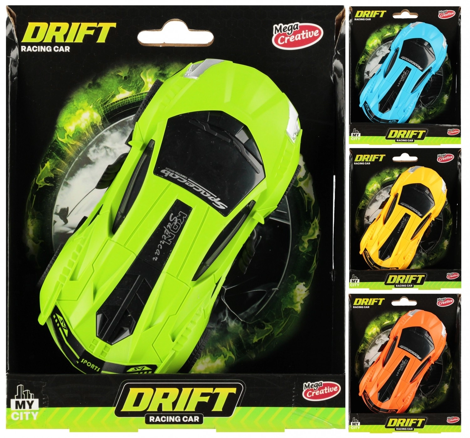 Mega Creative racerbils-driftbilen giver børn en autentisk oplevelse af høj hastighed og drifting. Træk den blot tilbage, slip, og bilen kører selv afsted. Takket være det specielle ekstra hjul klarer den glatte og effektfulde slinger, som vil begejstre enhver racerløbsfan.