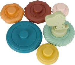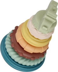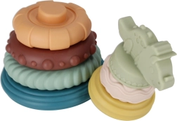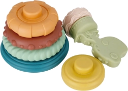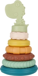 BAB BAM stabelpyramide med dinosaur er et ideelt sanselegetøj til spædbørn og tumlinge. Farverige ringe med forskellige overflader (riller, knopper, bølger) indbyder til udforskning, tygning og stabling på den centrale pind. Barnet træner naturligt greb, sortering efter størrelse og koordination.