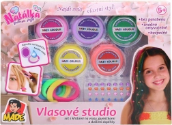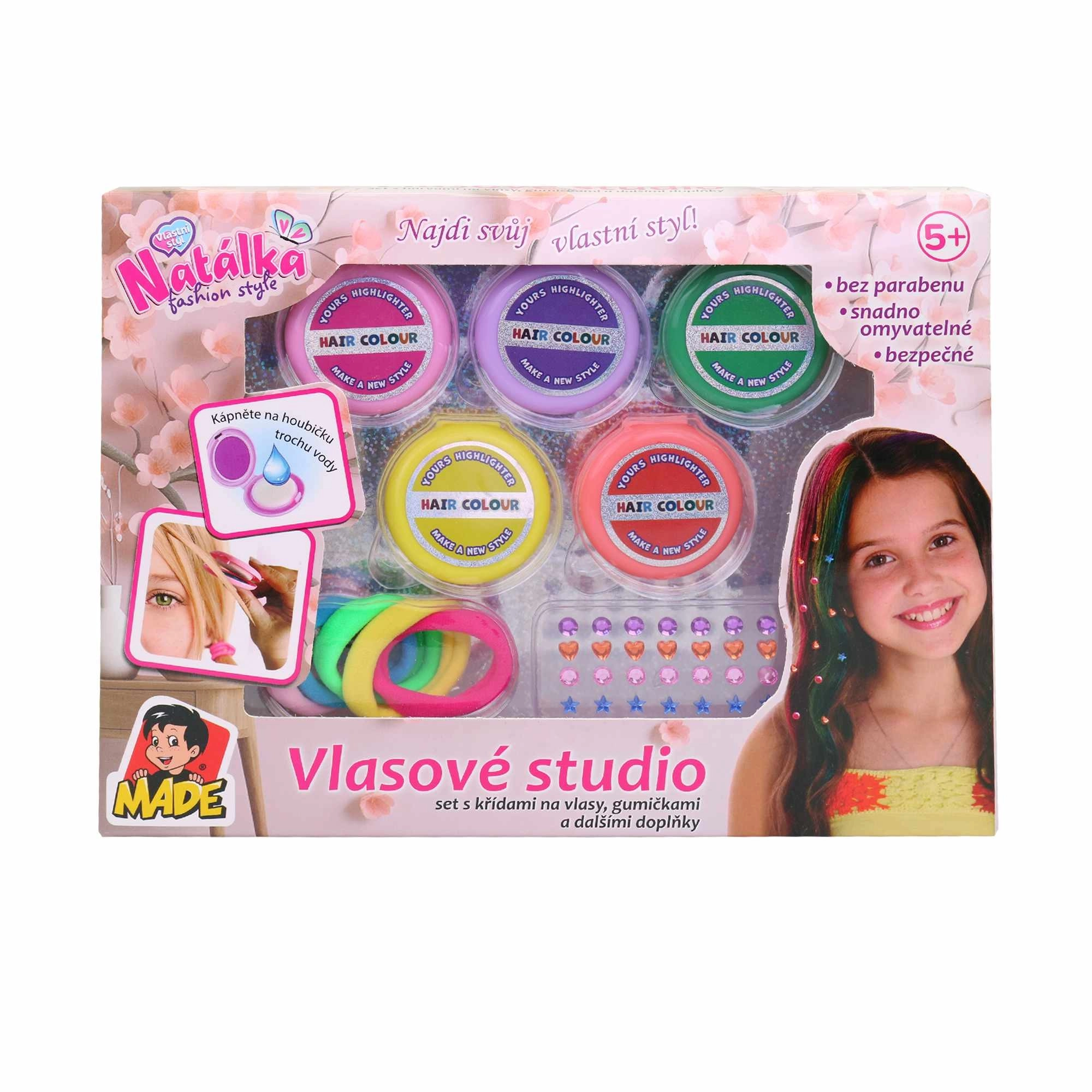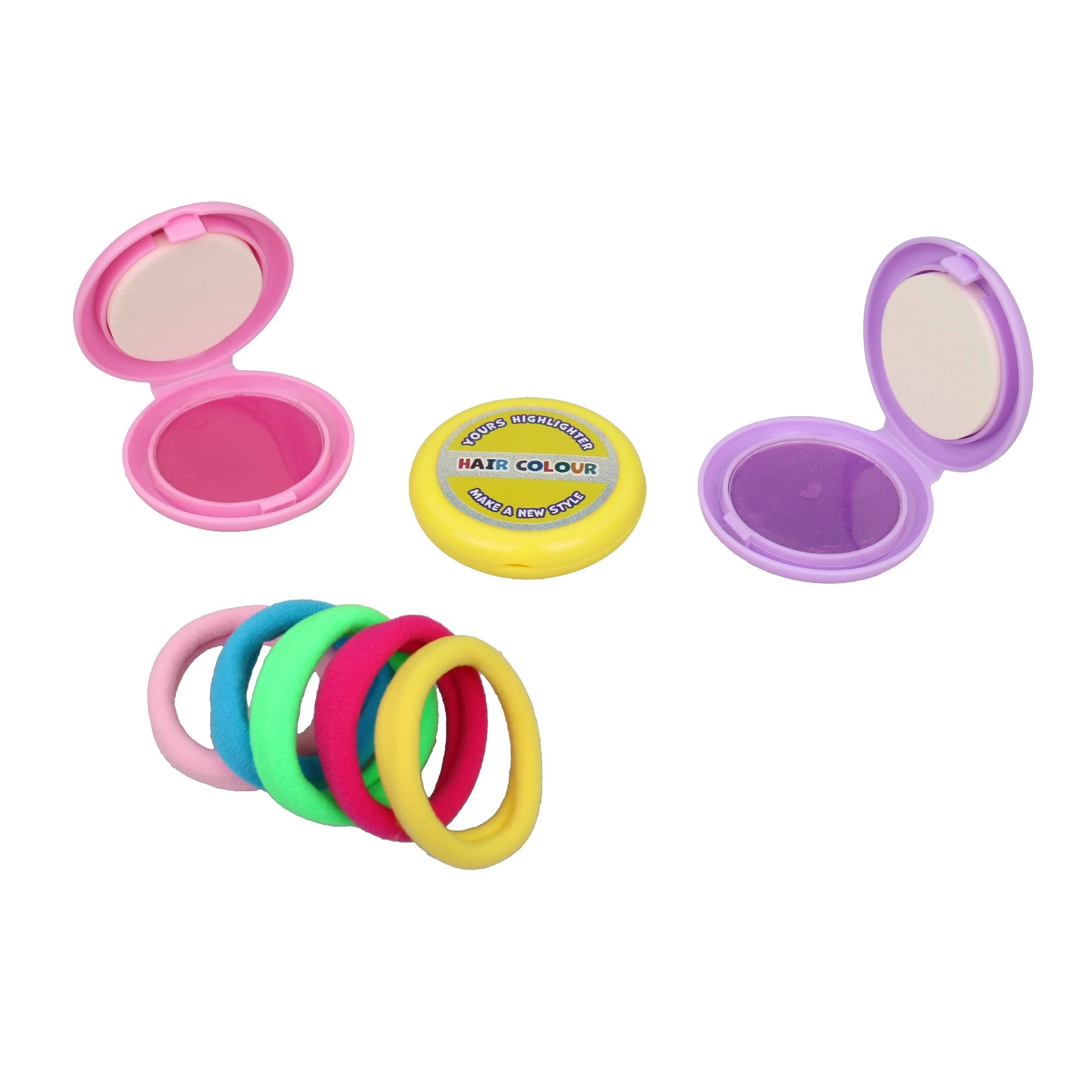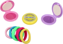 Børnesæt hårstudio er det perfekte valg til små stylister, der elsker farverige frisurer. Lav nemt farvede striber – læg en hårlok i, luk applikatoren og træk den nedad. Hurtig og sjov forvandling, 5 kraftige farver, sikker og let at vaske ud. Få håret til at stråle med elastikker og dekorative sten for det perfekte finish.