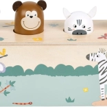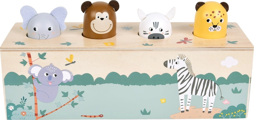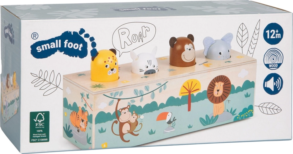 Interaktivt legetøj i træ af FSC 100 % certificeret træ giver både leg og læring: når du trykker, springer dyrenes hoveder op og der afspilles autentiske lyde af elefant, abe, zebra og leopard. Understøtter finmotorik, auditiv perception og forståelse af årsag og virkning, og glæder samtidig med robust udførelse og moderne safari-design.