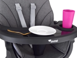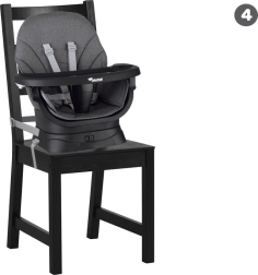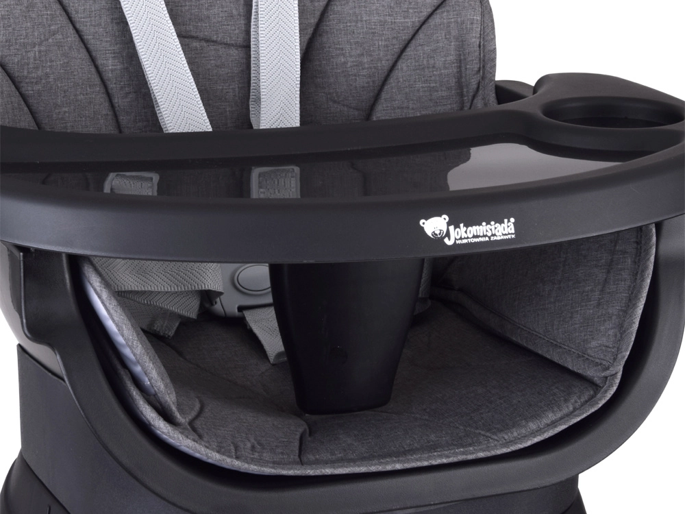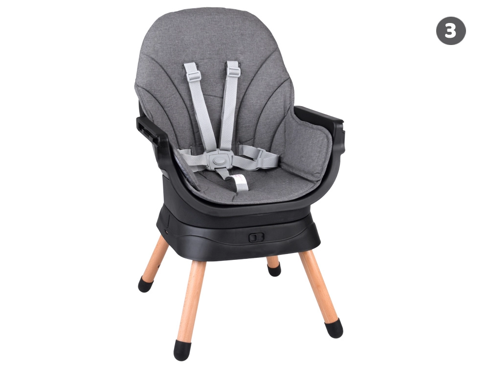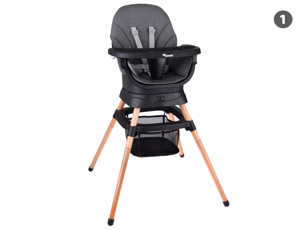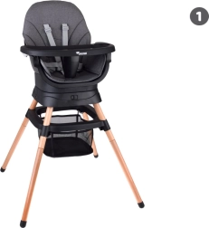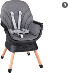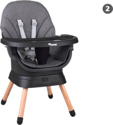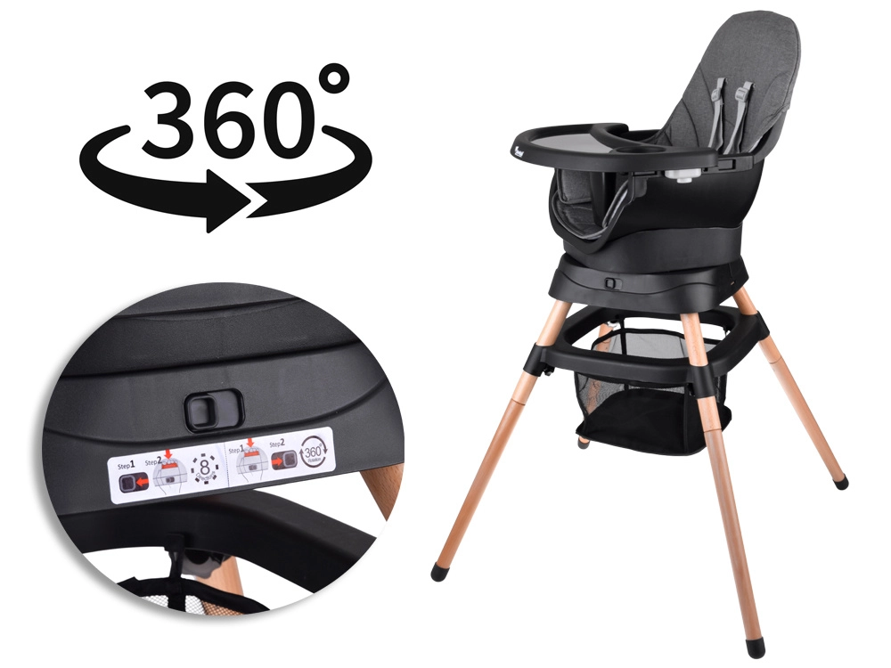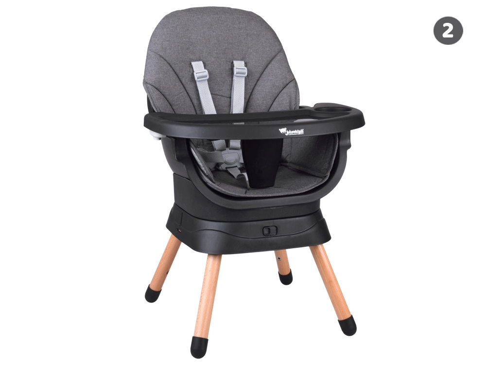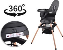 Den multifunktionelle 6-i-1 højstol kombinerer komfort, sikkerhed og praktikalitet i én løsning. Takket være den gennemtænkte modulære konstruktion kan den nemt ændres til en høj højstol, en lav stol med bakke, en selvstændig lænestol, et sæde til fastgørelse på en spisebordsstol, en høj taburet eller en lav skammel. Det 360° roterende sæde med 8 låsepositioner sikrer optimal indstilling til både spisning og leg.