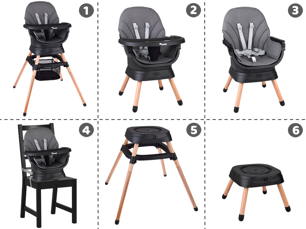 • 6 funktioner i én – højstol, lav stol, lænestol, sæde til påmontering på stol, høj taburet, lav skammel.
