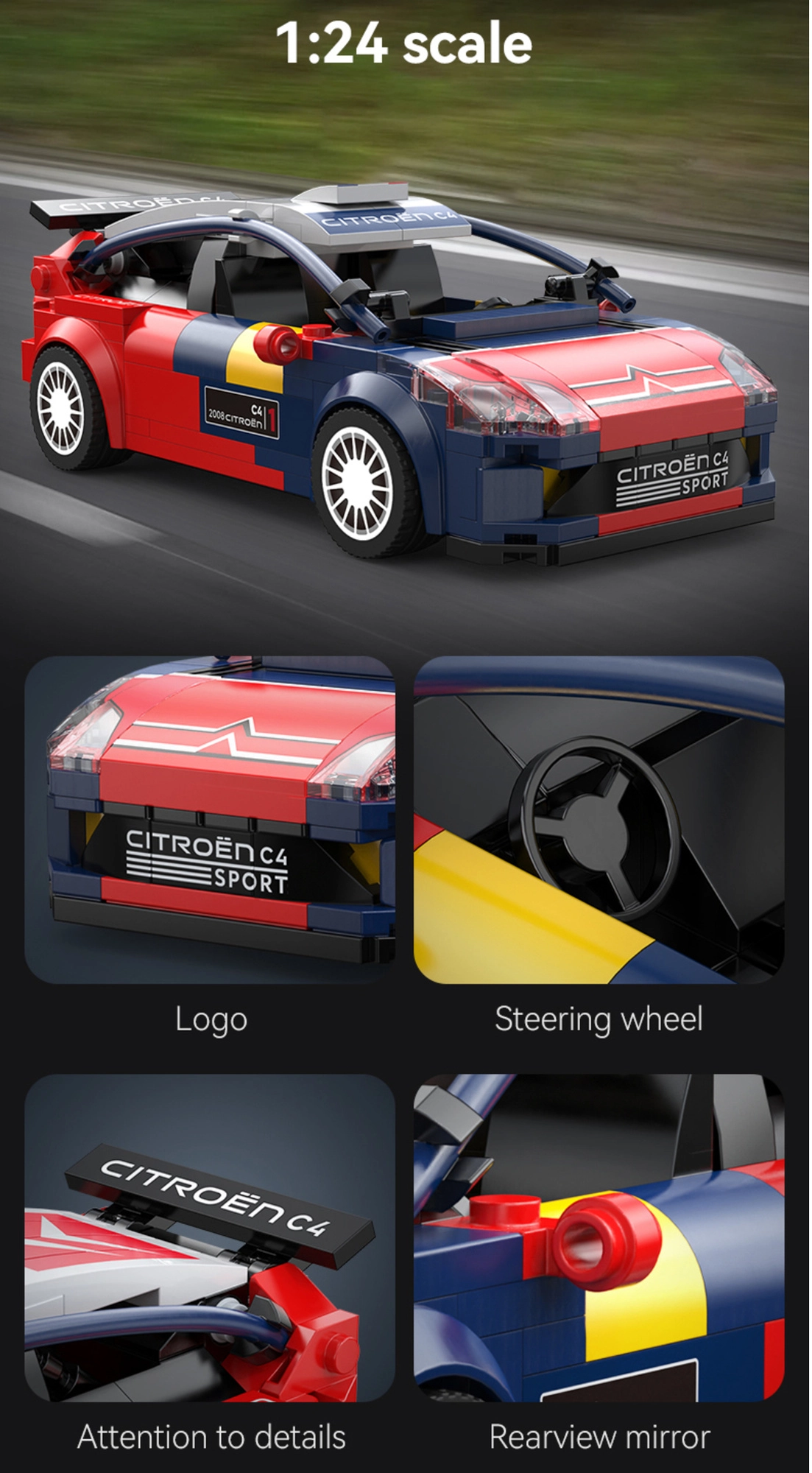 Det realistiske racelook med tryk, spoiler og aerodynamiske former gengiver trofast rallybilen CITROËN C4 WRC i 1:24‑skala.