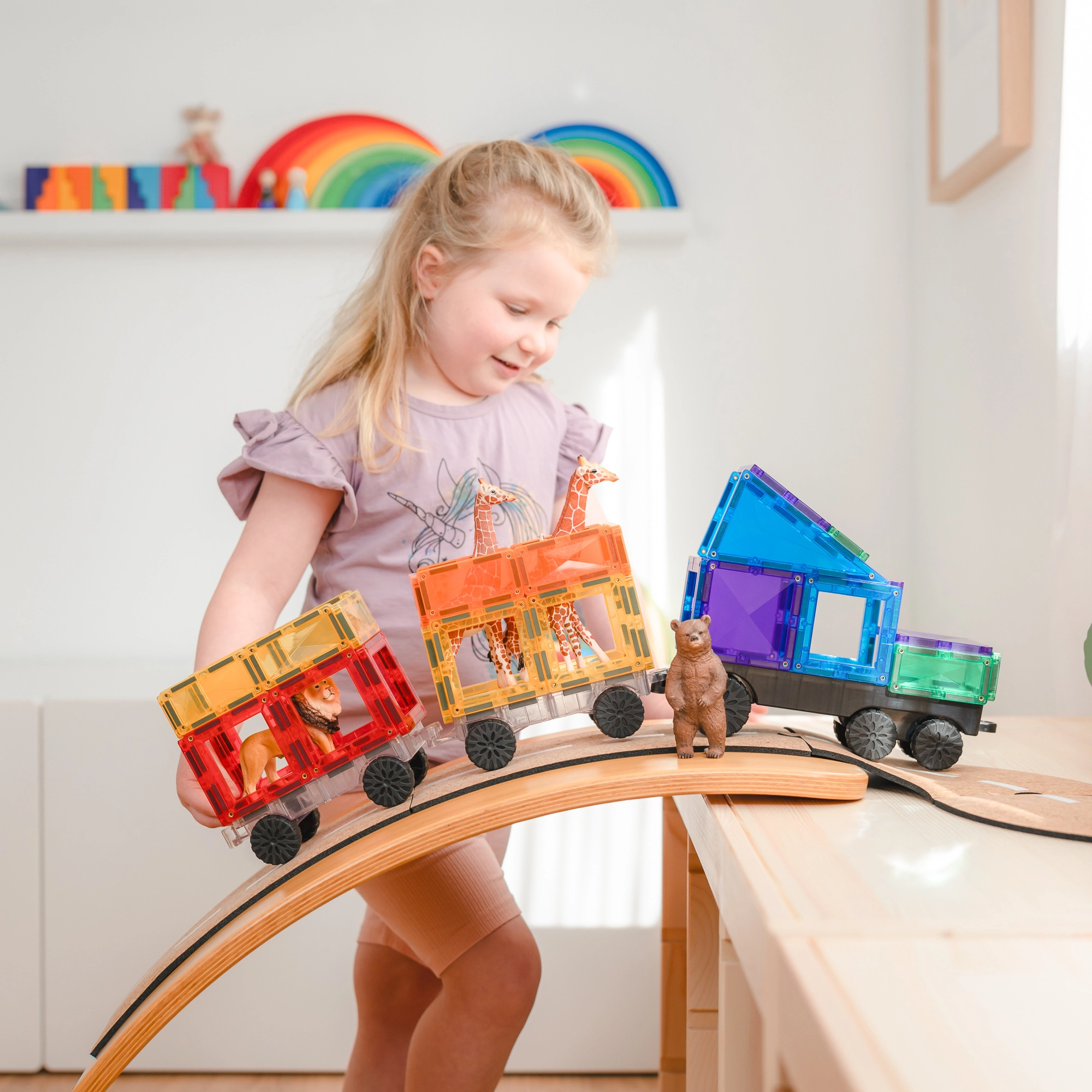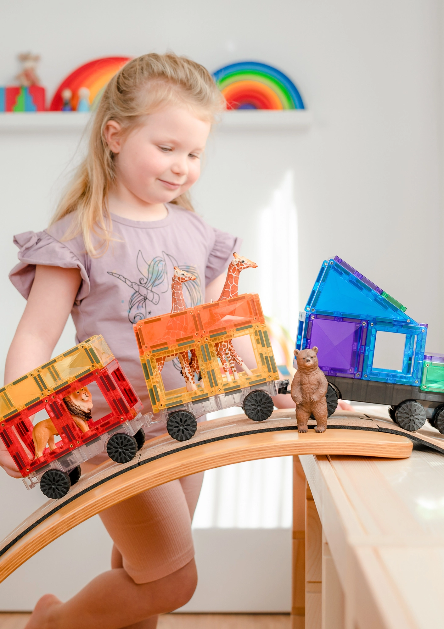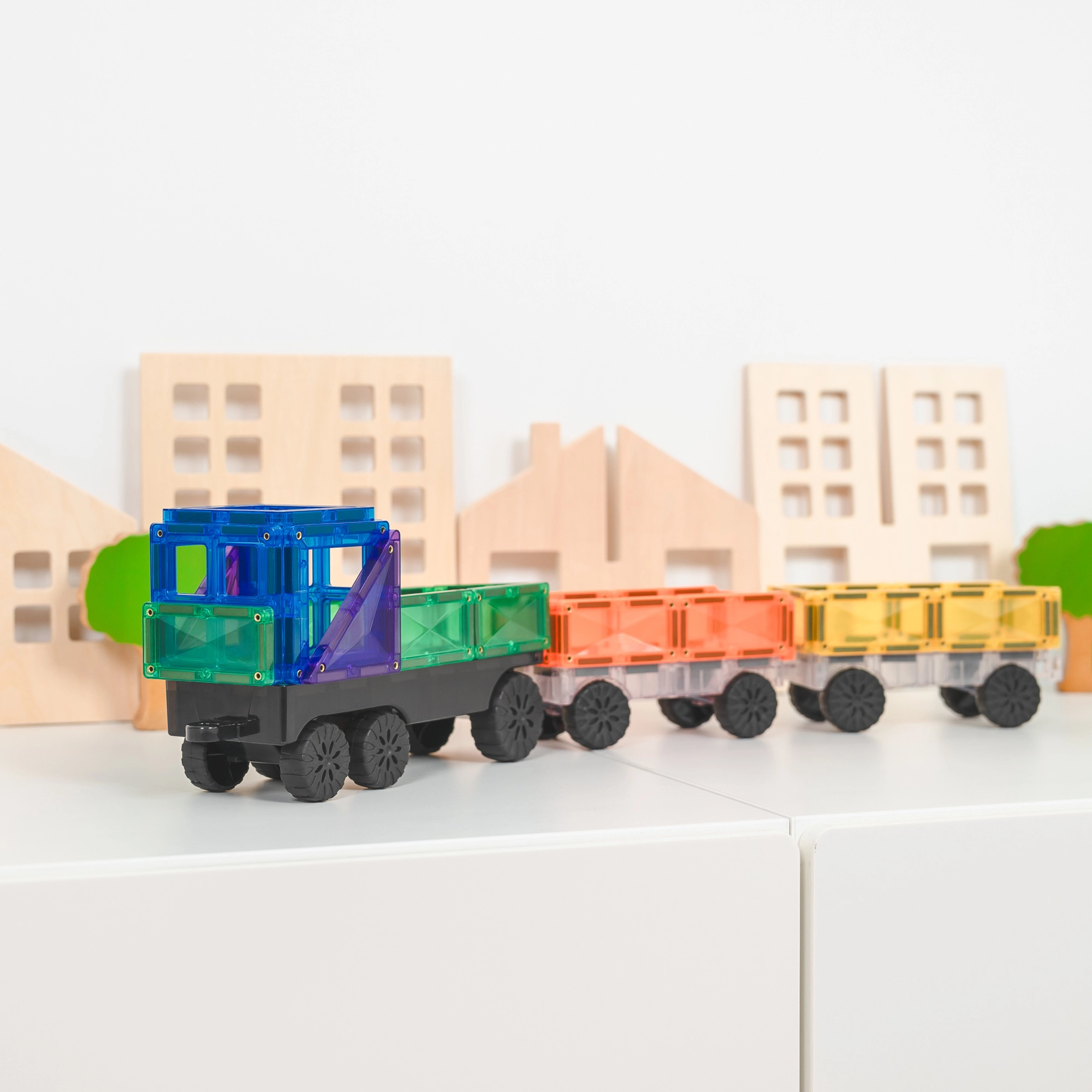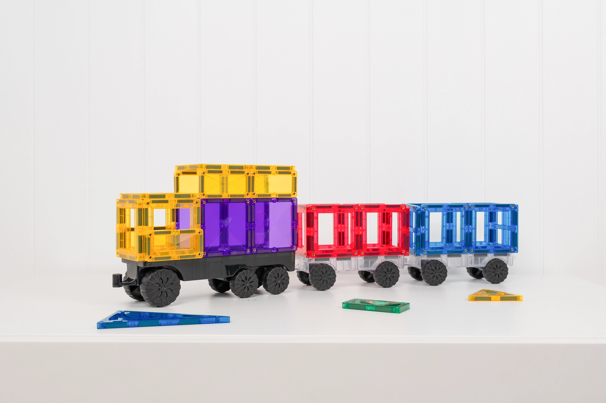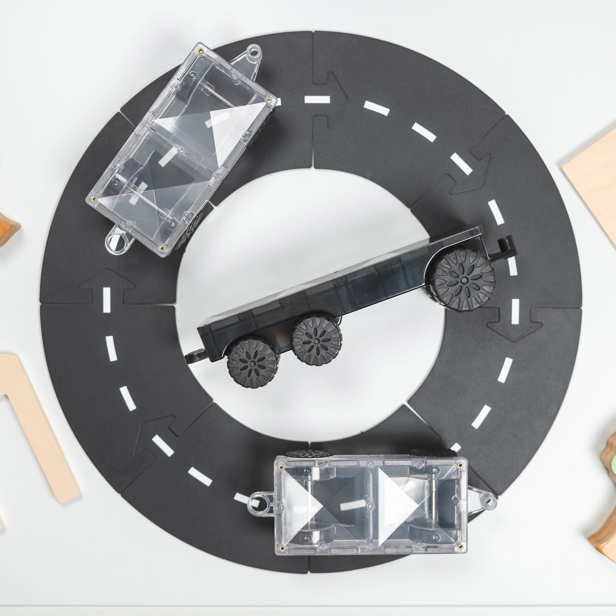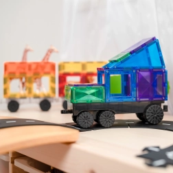To chassiser med hjul og en togbase forvandler fliserne til rullende modeller. Børn kan samle en lastbil, et lille tog eller et sæt med vogne og udvikler fantasi og koordination.
