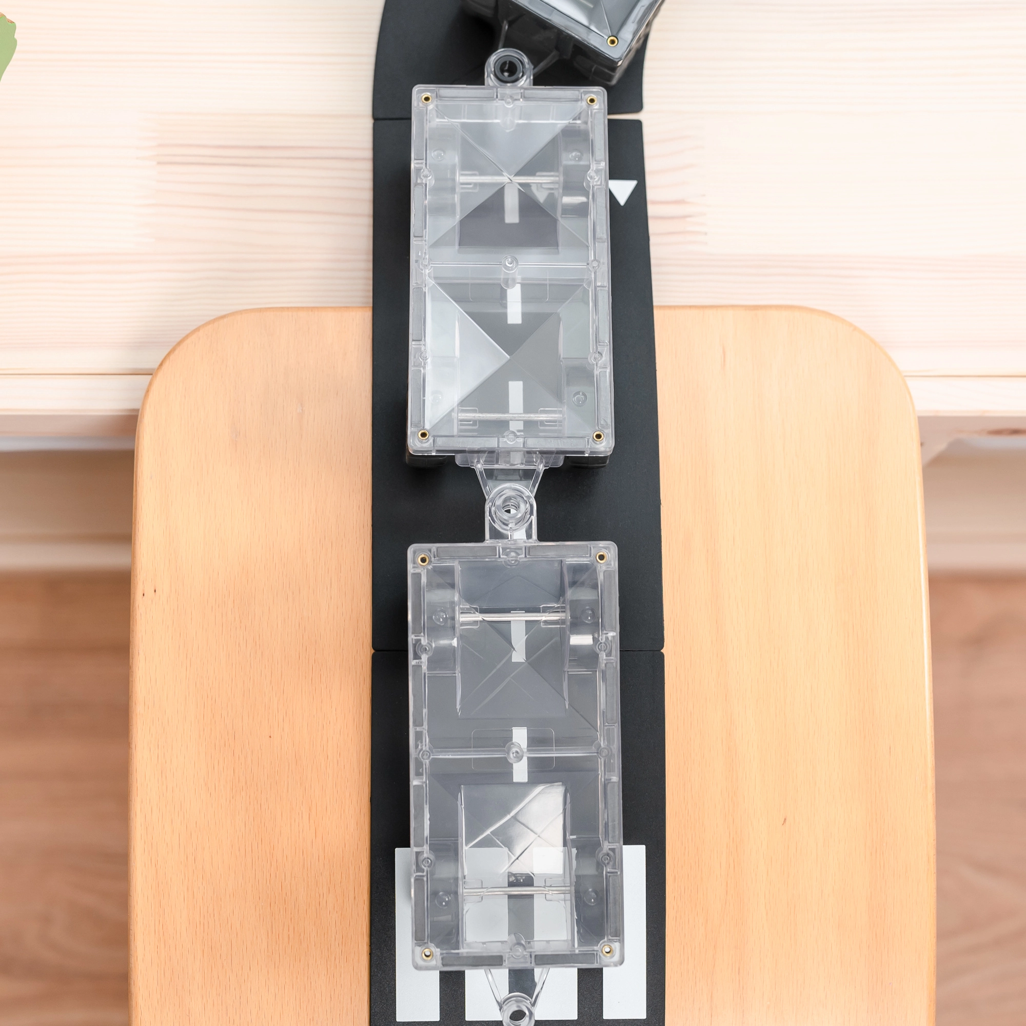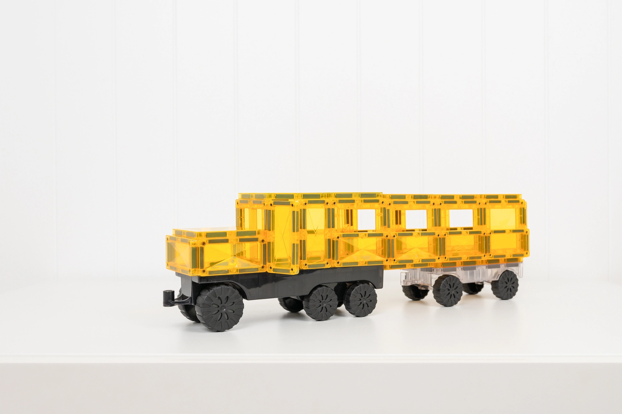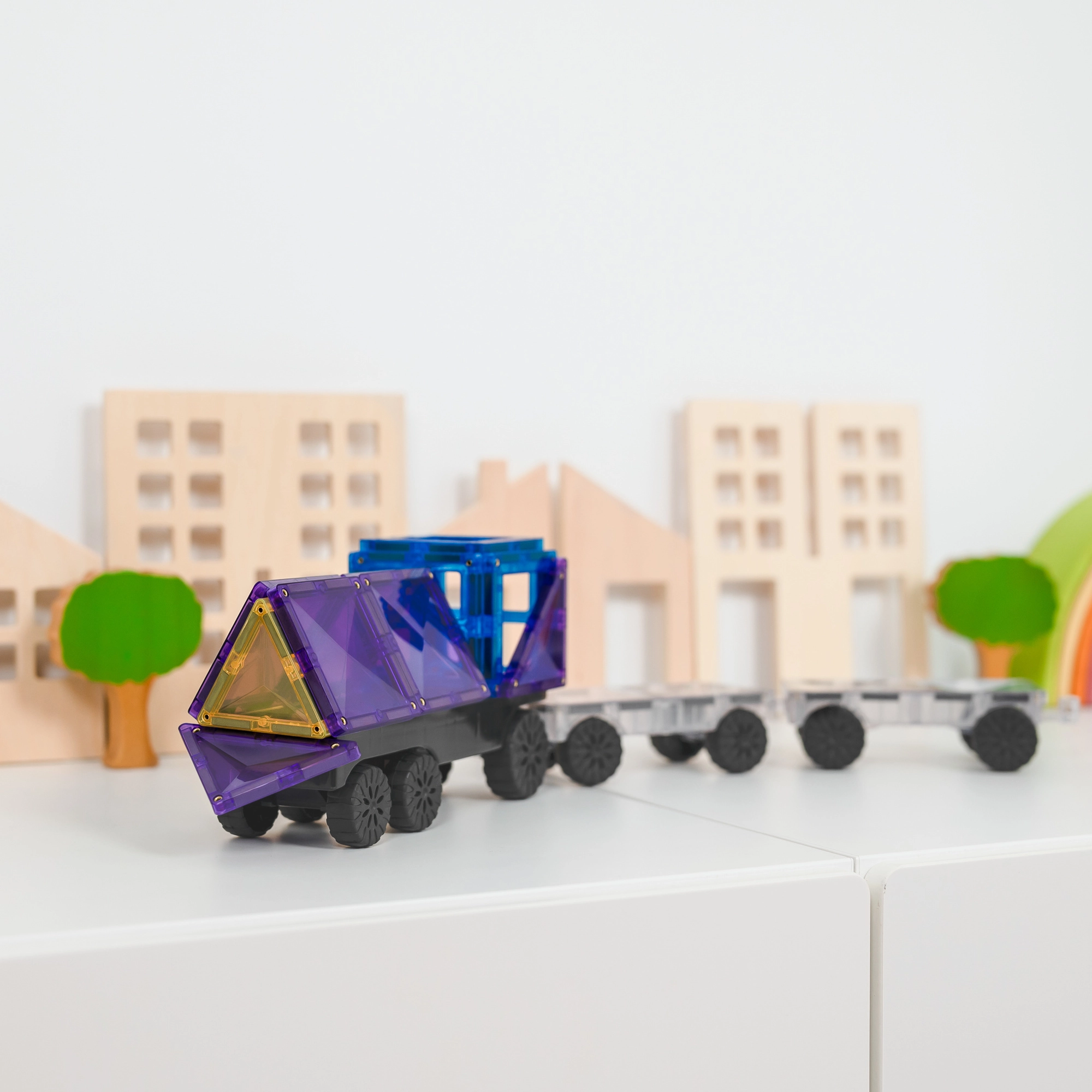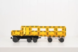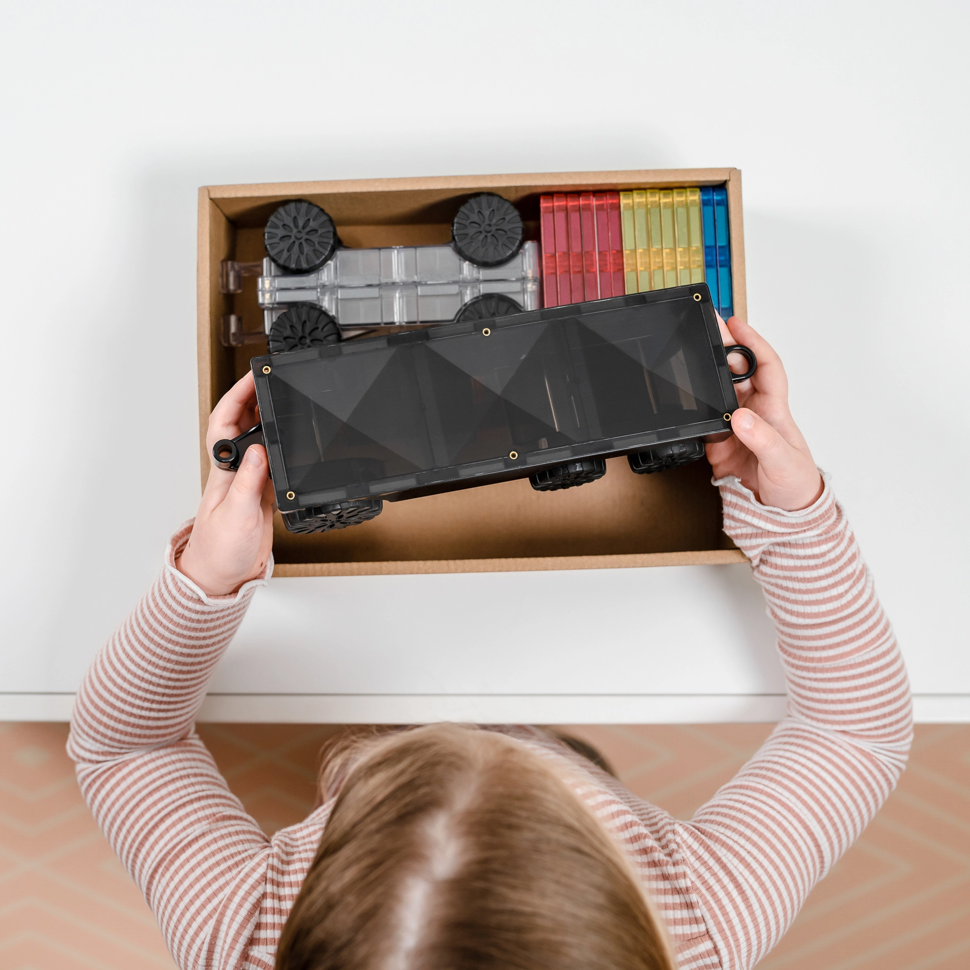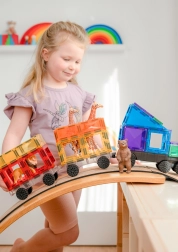 To chassiser med hjul og en togbase forvandler fliserne til rullende modeller. Børn kan samle en lastbil, et lille tog eller et sæt med vogne og udvikler fantasi og koordination.
