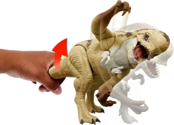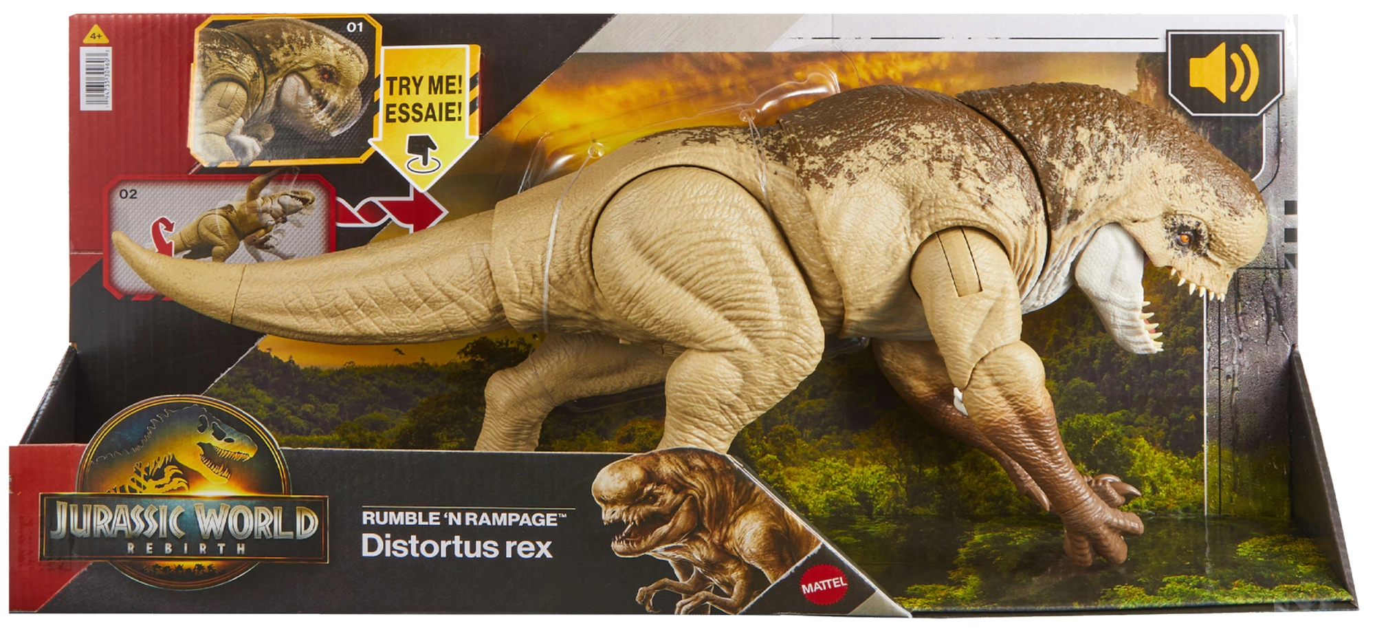 Oplev den mægtige rovdinosaur Distortus Rex med autentiske filmdetaljer, muskuløs silhuet og realistisk skæltekstur. Med et tryk på knappen aktiveres brøl og bid, og ved at dreje halen udløses et ødelæggende slag med poten. Figuren er perfekt til actionleg og udstilling.