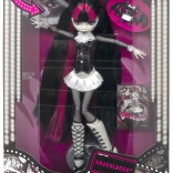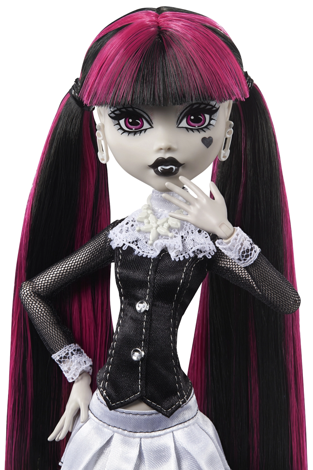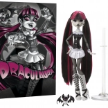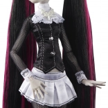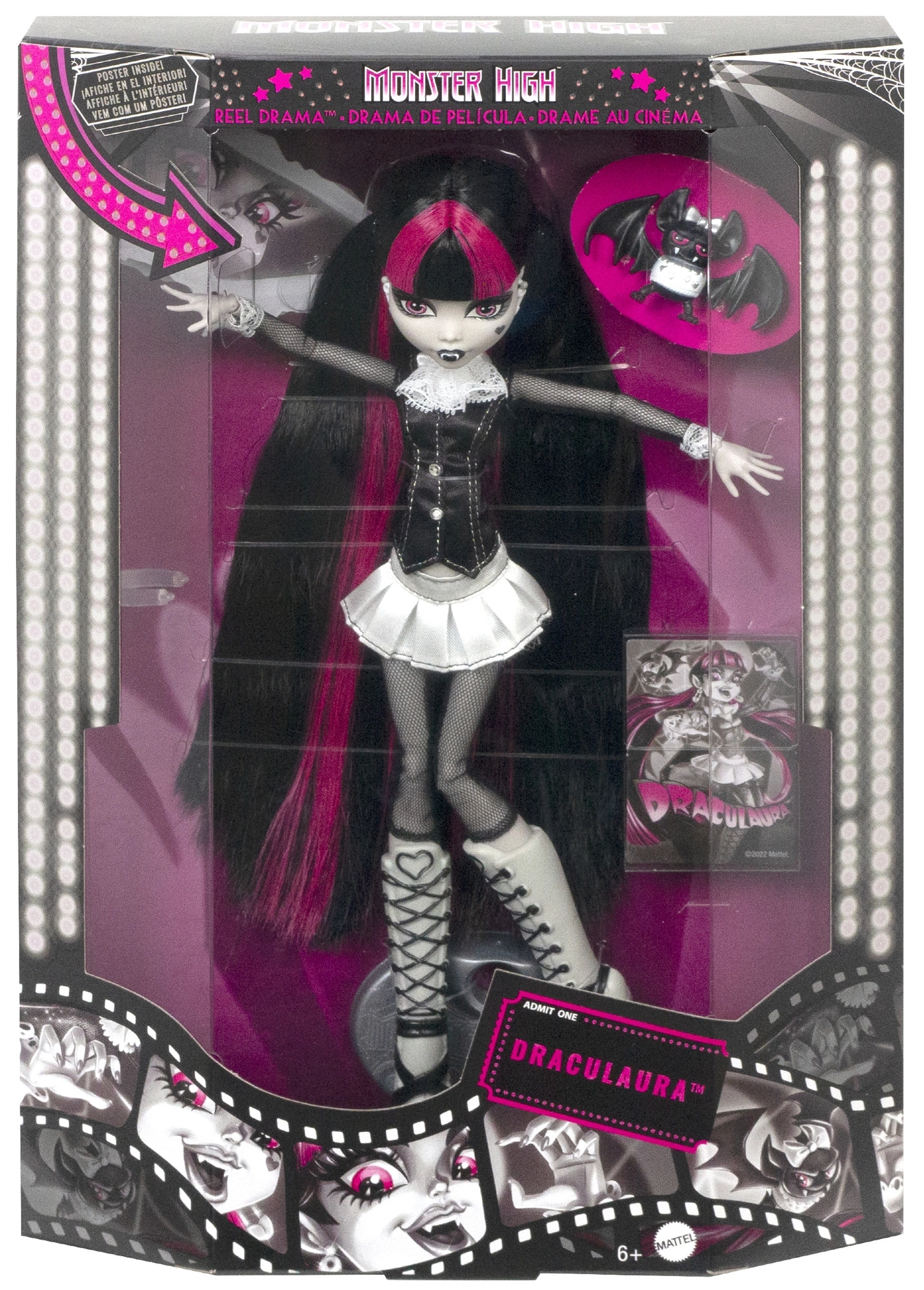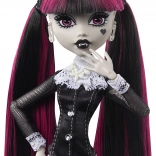 Draculaura fra Reel Drama-udgaven hylder filmklassikere – kontrastfuld sort-hvid stil med pink accenter, langt sort hår med pink striber og gotisk makeup skaber et markant look, der begejstrer både fans og samlere. Takket være fuld artikulation er den ideel til leg, foto og udstilling på standen.