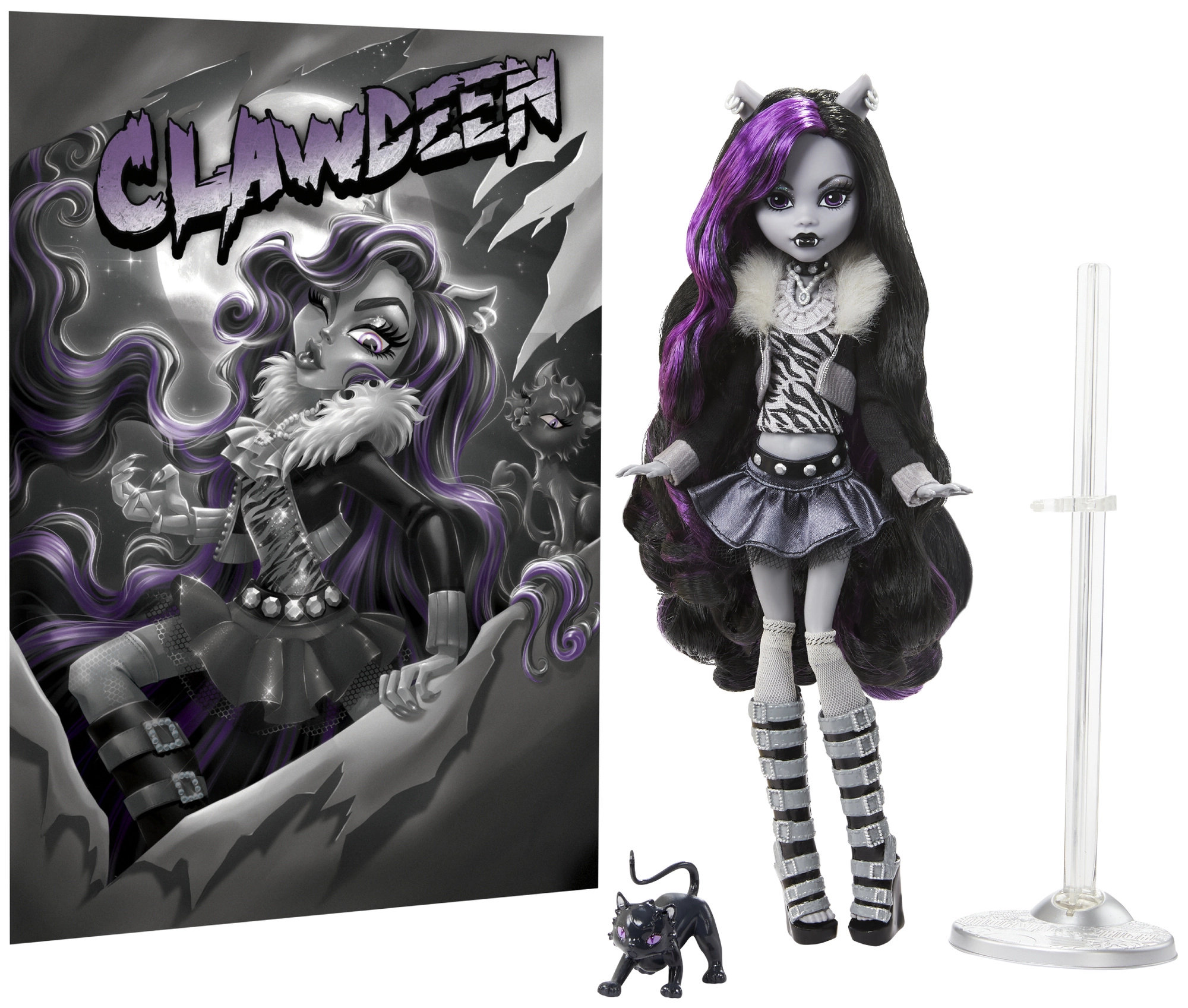 Stilfuld samlerdukke MONSTER HIGH Clawdeen Wolf fra Reel Drama-kollektionen hylder sort-hvide gyserfilm og seriens ikoniske stil. Hun er ca. 26 cm høj, har en fuldt ledet krop til kreativ posering og iøjnefaldende sort‑lilla hår. Med elegant retro outfit, stander og et sødt kæledyr – perfekt til leg og udstilling.