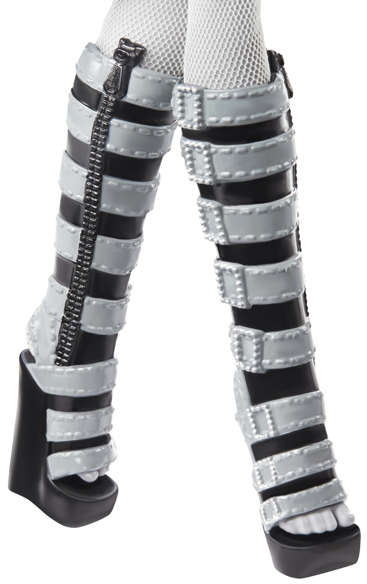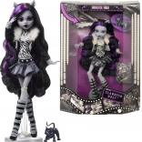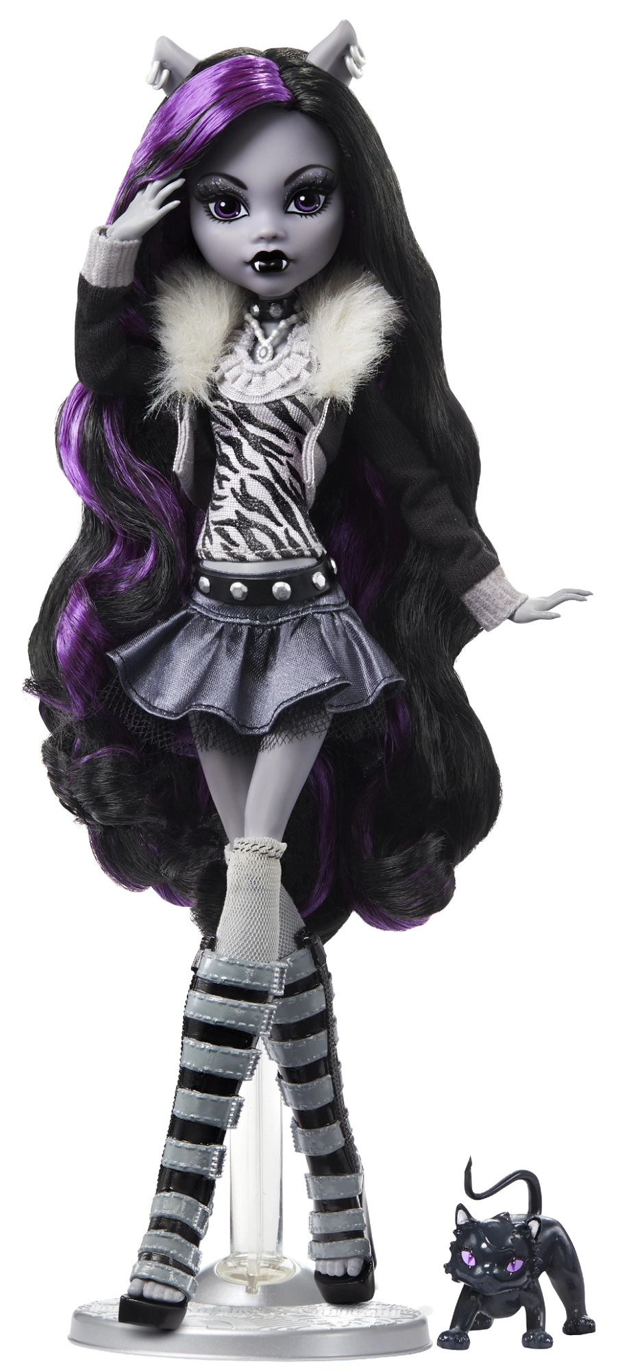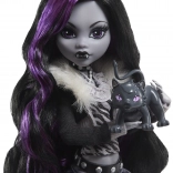 Oplev det unikke design fra Reel Drama: Clawdeen Wolf stråler i monokrom styling med kontrasterende lilla accenter. Detaljeret tøj med blød “fluffy” jakke, udvidet skørt og platformsandaler understreger hendes rå karakter. Takket være leddet artikulation kan hun nemt sættes i ikoniske positurer til vitrine og foto.