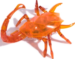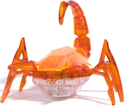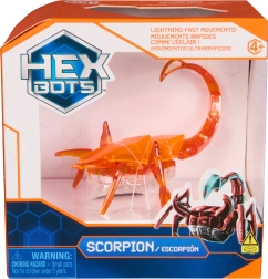 Den orange HEX BOTS-skorpion er en iøjnefaldende robotfigur med gennemsigtig krop, der imponerer med dynamisk bevægelse og lyseffekter. Vibrationsmekanismen sætter de mange ben i bevægelse, så den kan manøvrere smidigt, skifte retning, ramme vægge og underholdende vælte rundt. Den lysende hale giver legen et effektfuldt visuelt udtryk.