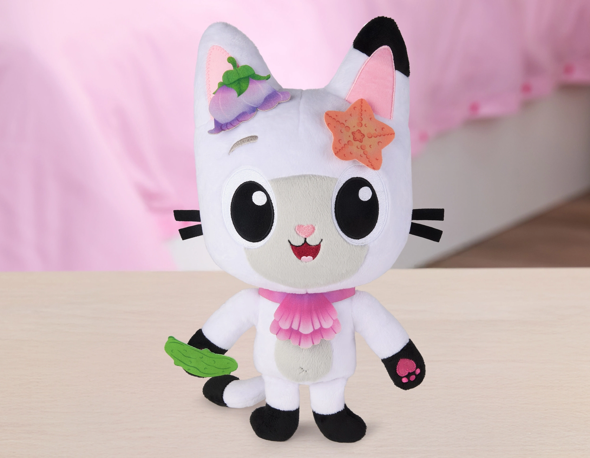Denne plysefigur passer perfekt ind i universet GABBY'S DOLLHOUSE og kan reagere på udvalgte legesæt (f.eks. Gabbys store dukkehus og hårbøjle med katteører – sælges separat). Med en størrelse på ca. 30 cm kan børn nemt tage den med overalt.