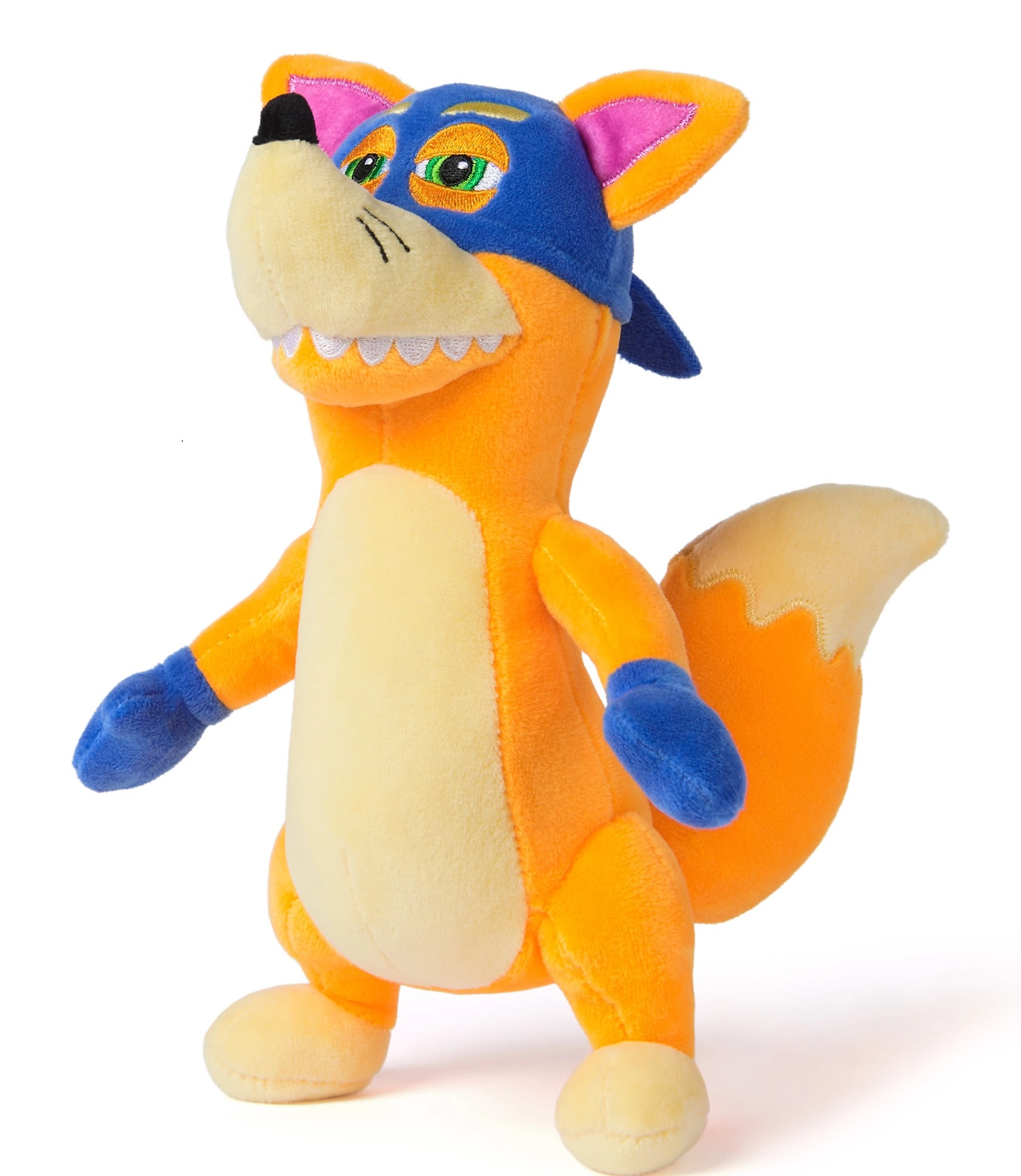 Tag ræven Swiper med hjem, den berømte “ballademager” fra serien DORA UDFORSKEREN. Den plyssede figur i den ikoniske blå maske og handsker har en blød overflade, broderede øjne og tænder og er designet til hverdagens kram.