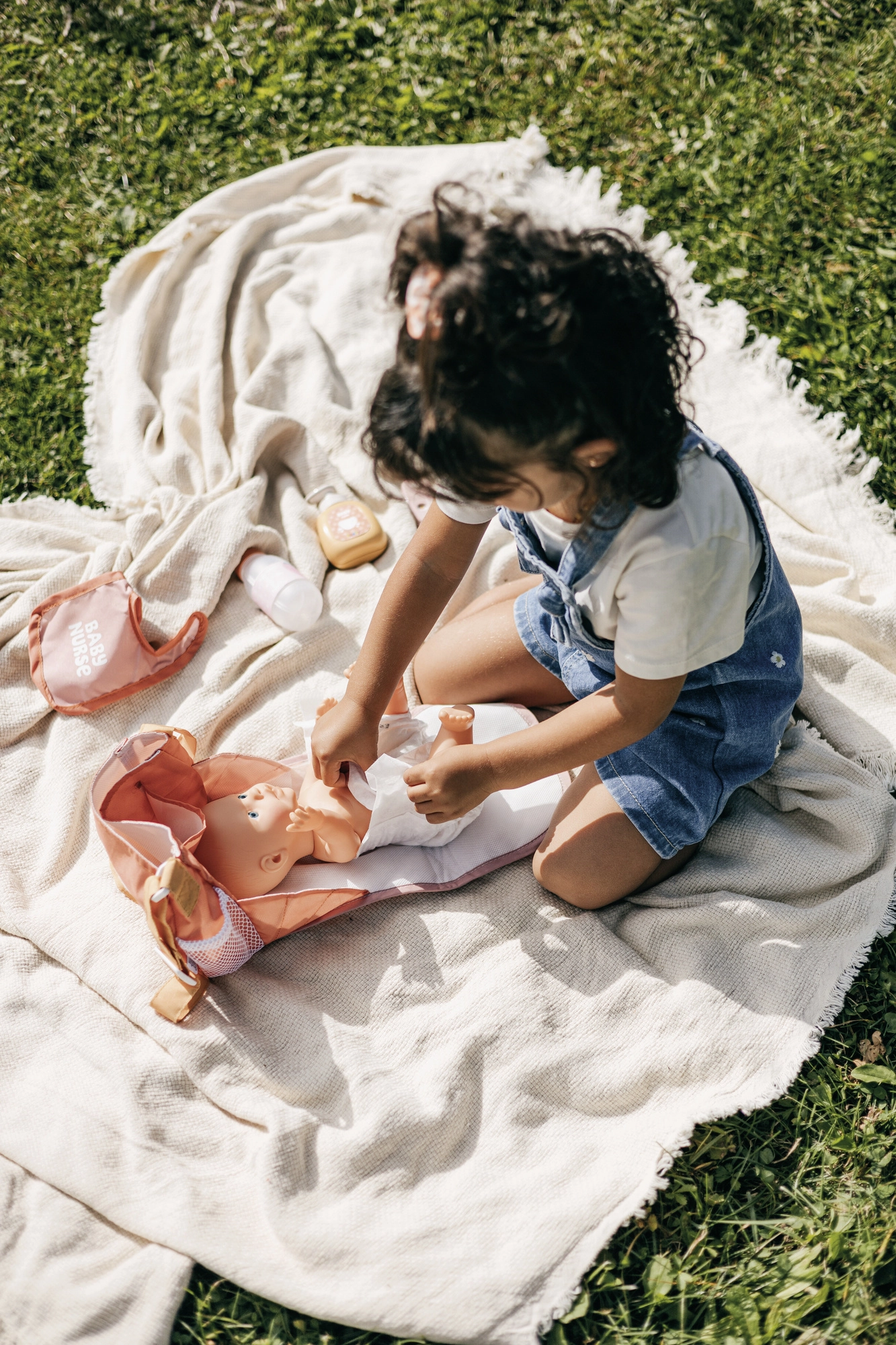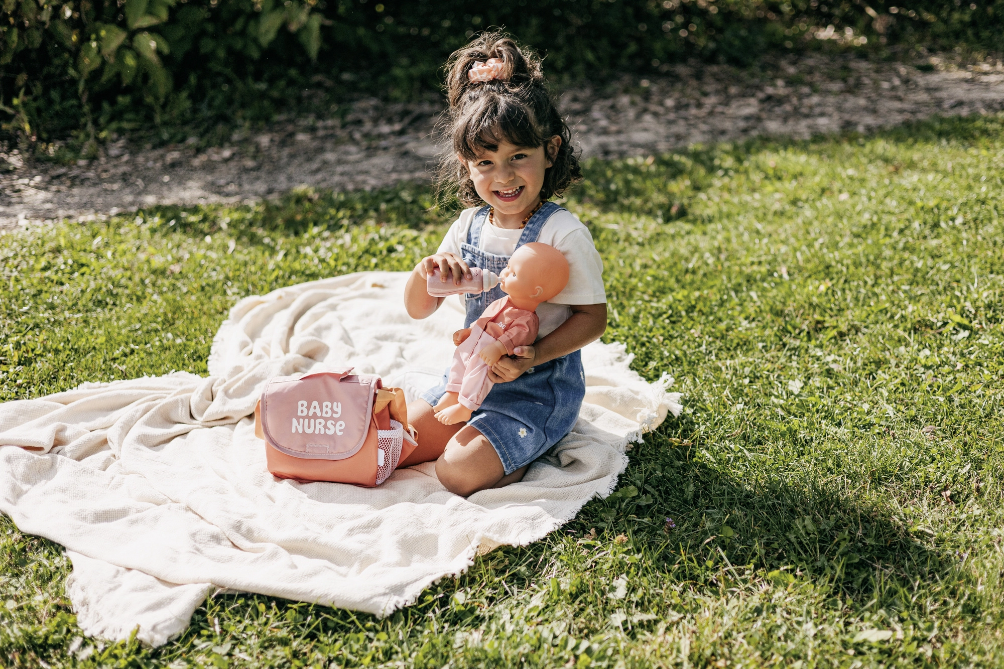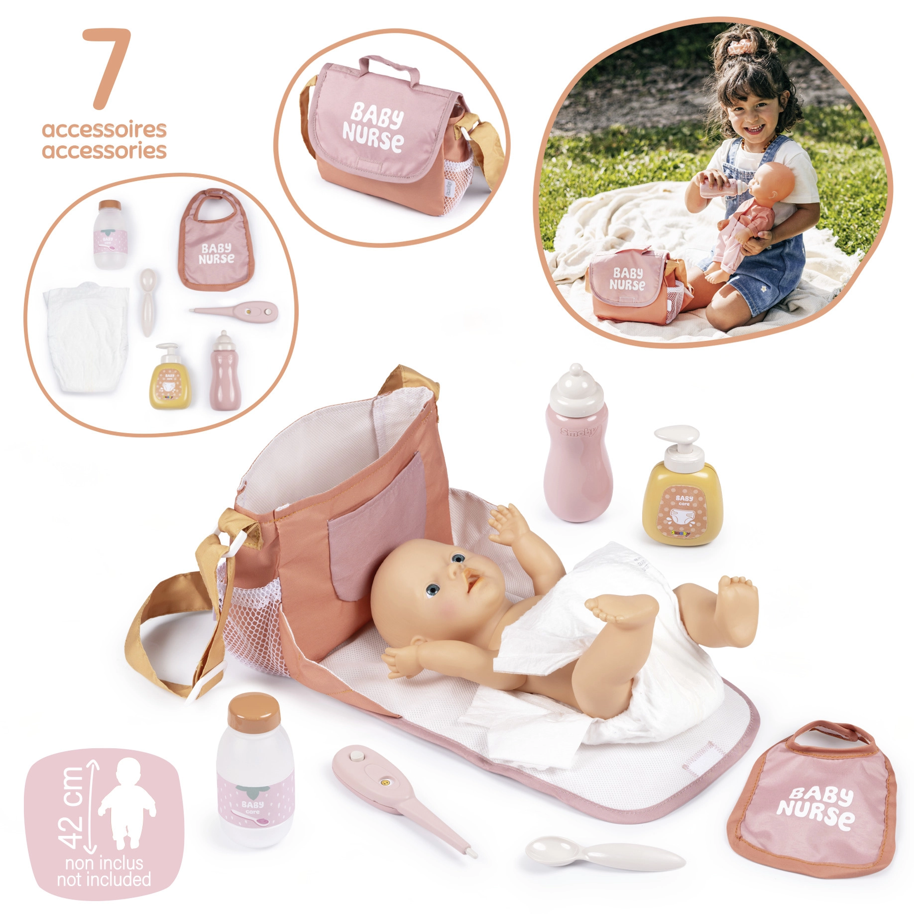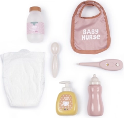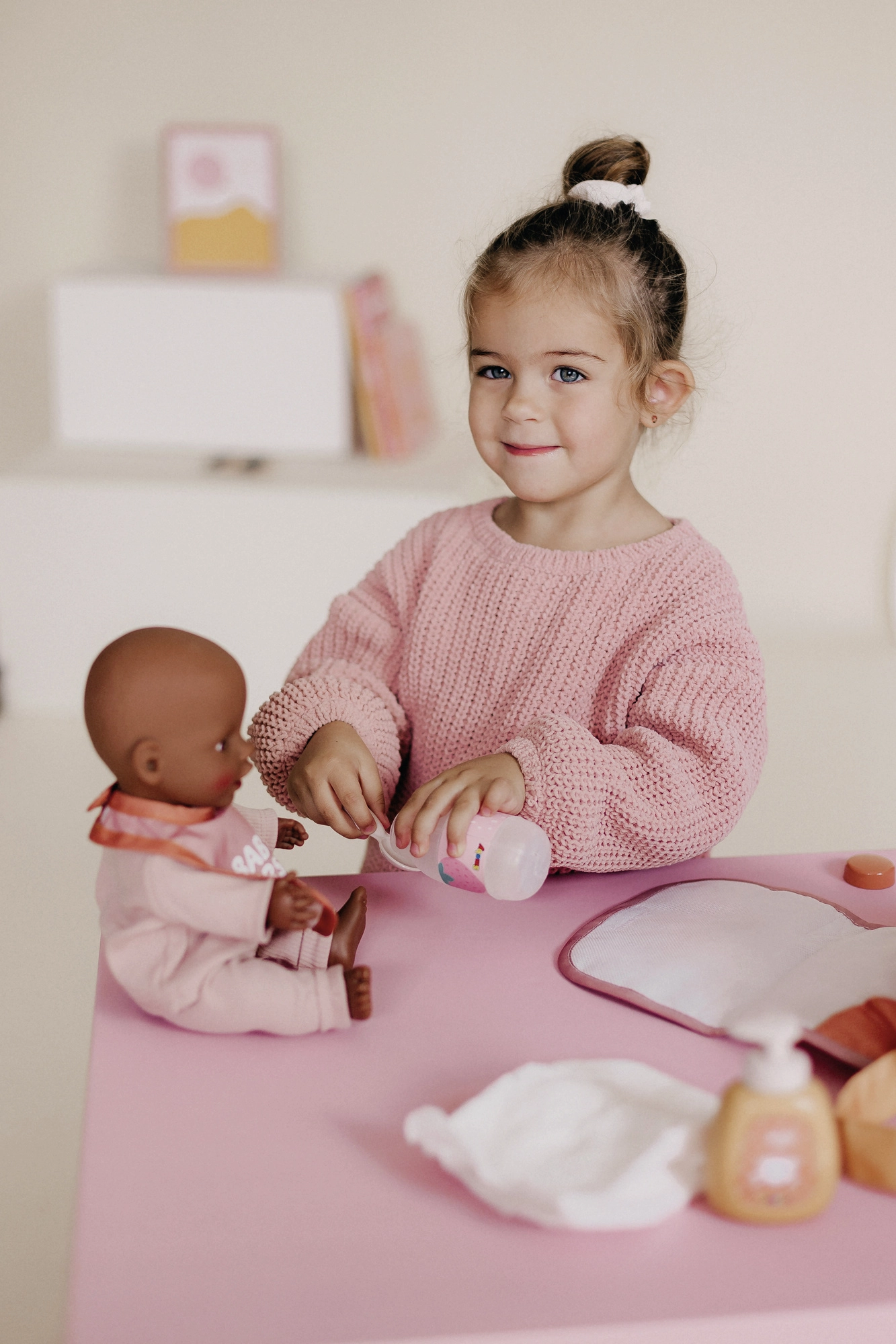 Alt til daglig leg og efterligning af ægte omsorg følger med: mælkeflaske, termometer, sirup med ske, shampooflaske med dosering, hagesmæk og ble til dukke. Sættet udvikler kreativitet, finmotorik og lærer ansvar og kærlig omsorg.