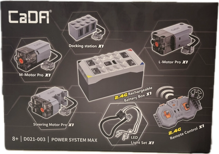 Kompatibilitet med CADA-byggesæt og andre sæt i standard klodsestørrelse gør installationen enkel – mange byggevejledninger tager allerede højde for drift og lys. Det er blot at tilslutte og nyde kørsel frem/tilbage, præcis styring og kontrol af lys.