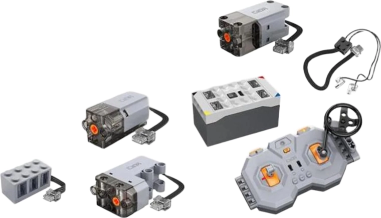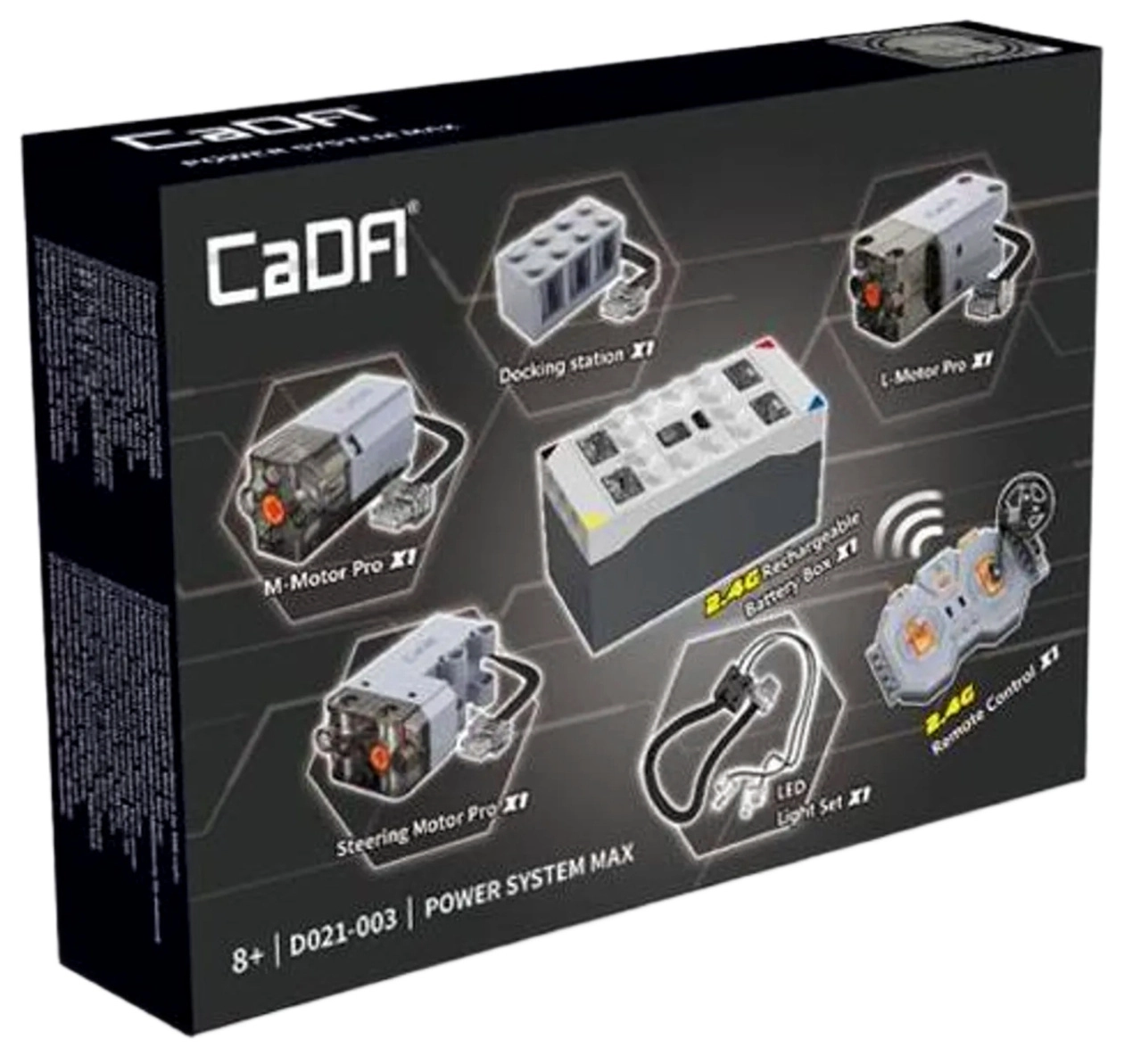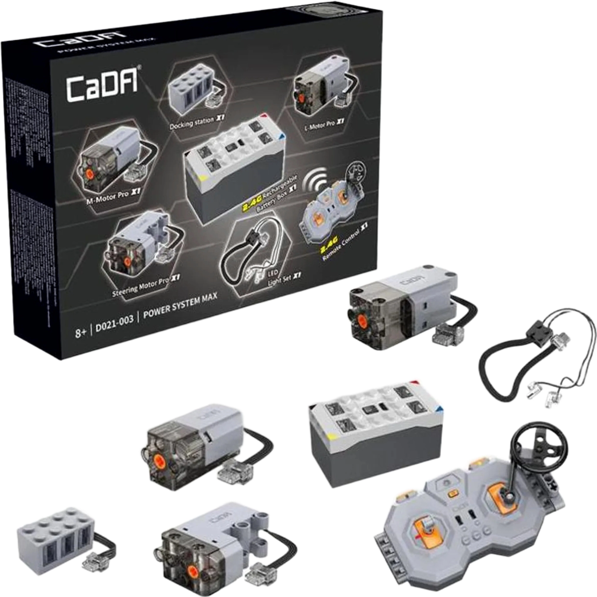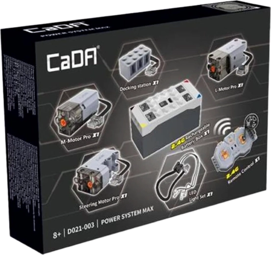 Udvid dine byggesæt med realistisk drift og 2,4 GHz fjernstyring med sættet CaDA Power System MAX. Pakken indeholder et batteri, tre kraftige Pro-motorer (M, L, Steering), LED-belysning, en fjernbetjening og et USB-opladningskabel til lang og problemfri leg uden forstyrrelser.