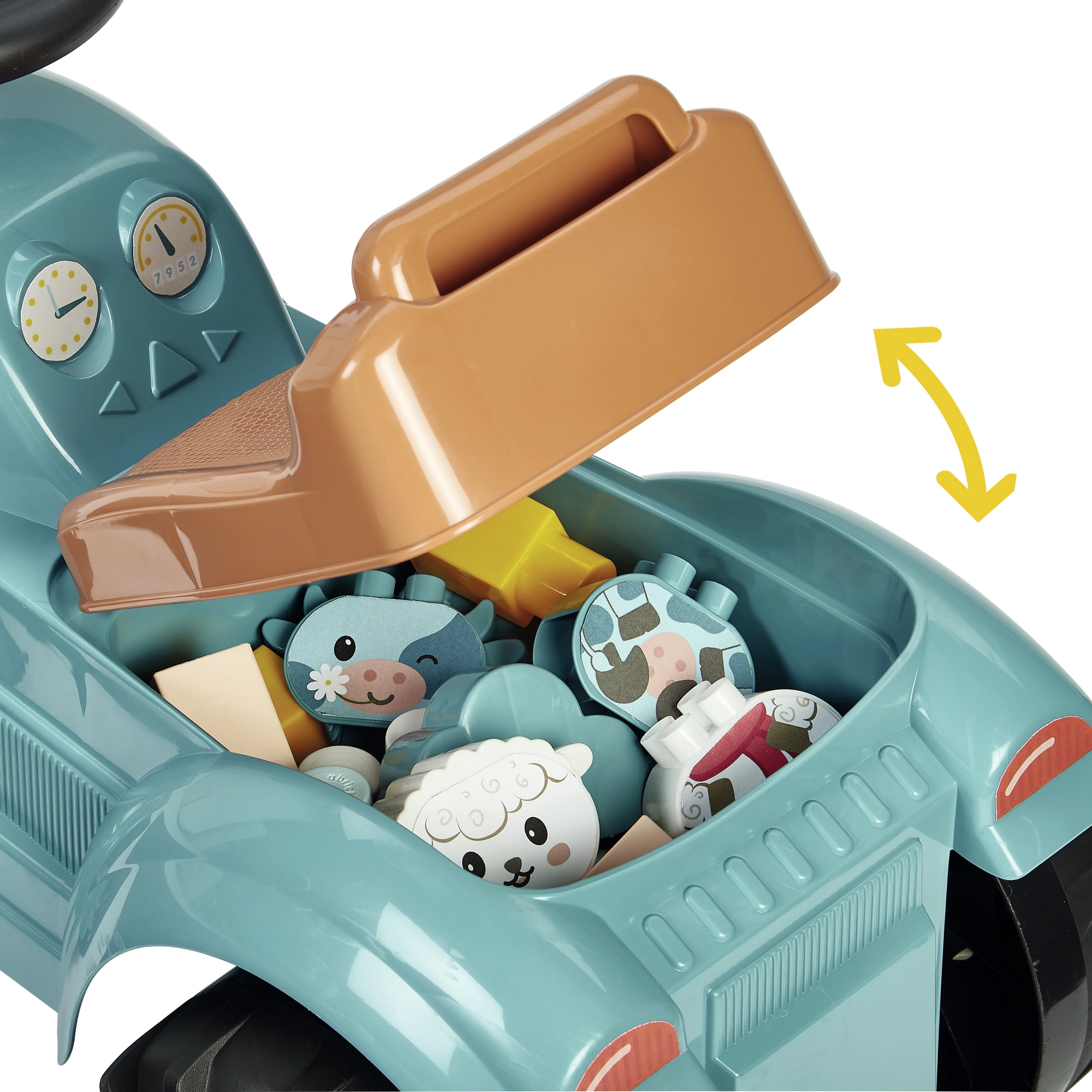 Pakken indeholder 15 byggesten, som barnet nemt kan bruge til at samle en lille ko og et får, samt flere dele til kreativt byggeri. Sættet understøtter udvikling af fin- og grovmotorik, koordination og rolleleg som landmand. Hele køretøjet måler cirka 86 × 32,5 cm og er ideelt til børn 12–36 måneder.
