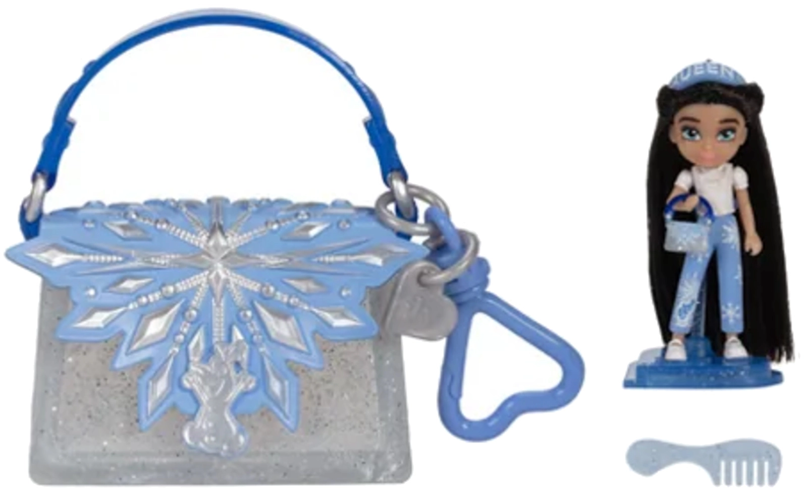 Denne mode-minidukke fra kollektionen Disney ILY 4Ever Tote Teenies forener mode og fantasi. Hun har langt mørkt hår og er klædt i et blå-hvidt outfit med snestjernetema, komplet med sporty sko og en mini-håndtaske med snestjerne. Ideel til små fans af Disney-universet og samlere.