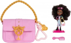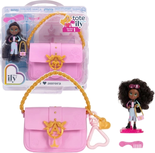 Der medfølger også en større lyserød taske med Aurora-motiv, hvor dukken og alle småting nemt kan opbevares. Med hanken kan barnet let tage den med overalt. I pakken finder du desuden charmerende tilbehør til videre leg og udstilling – kam, solbriller og dukkeholder.