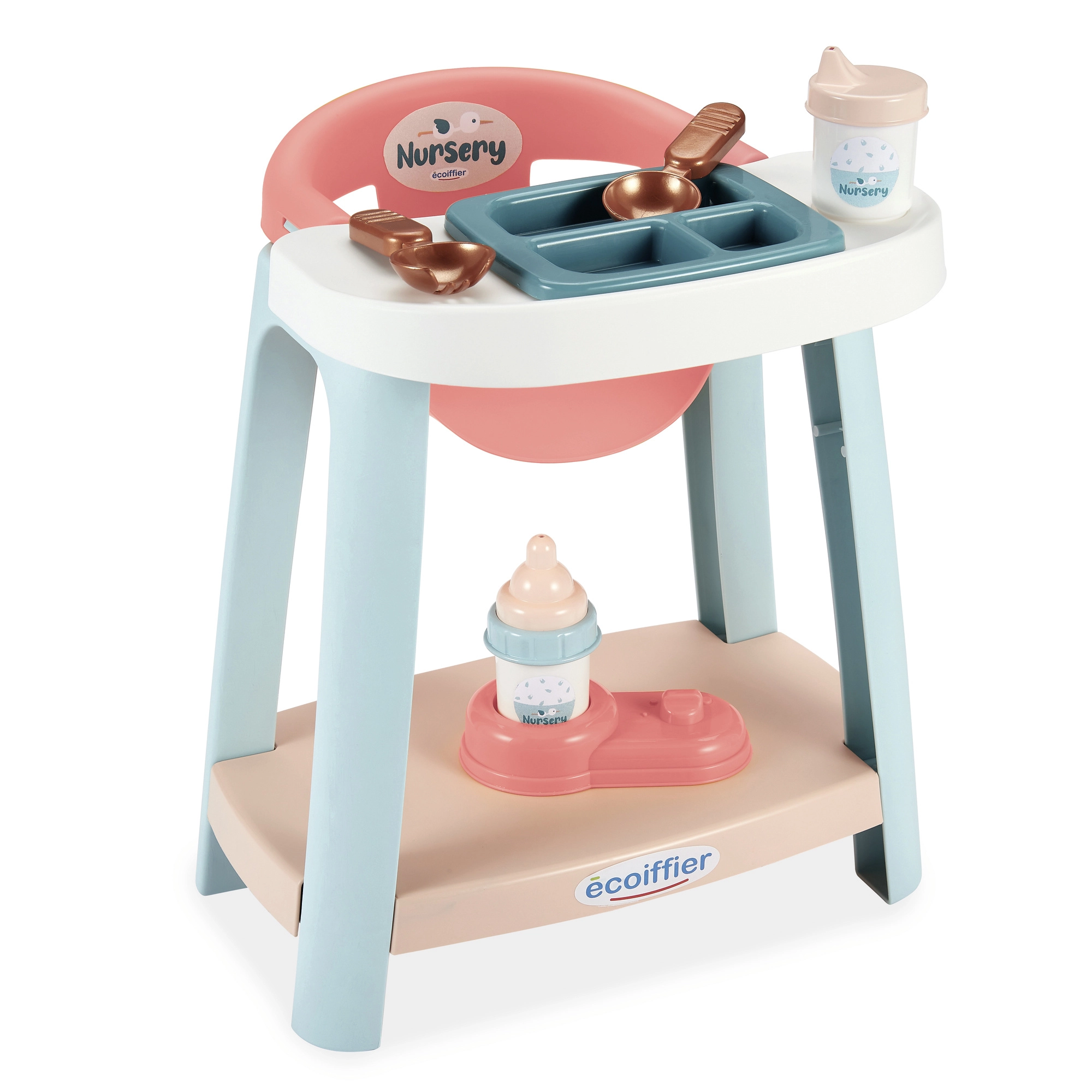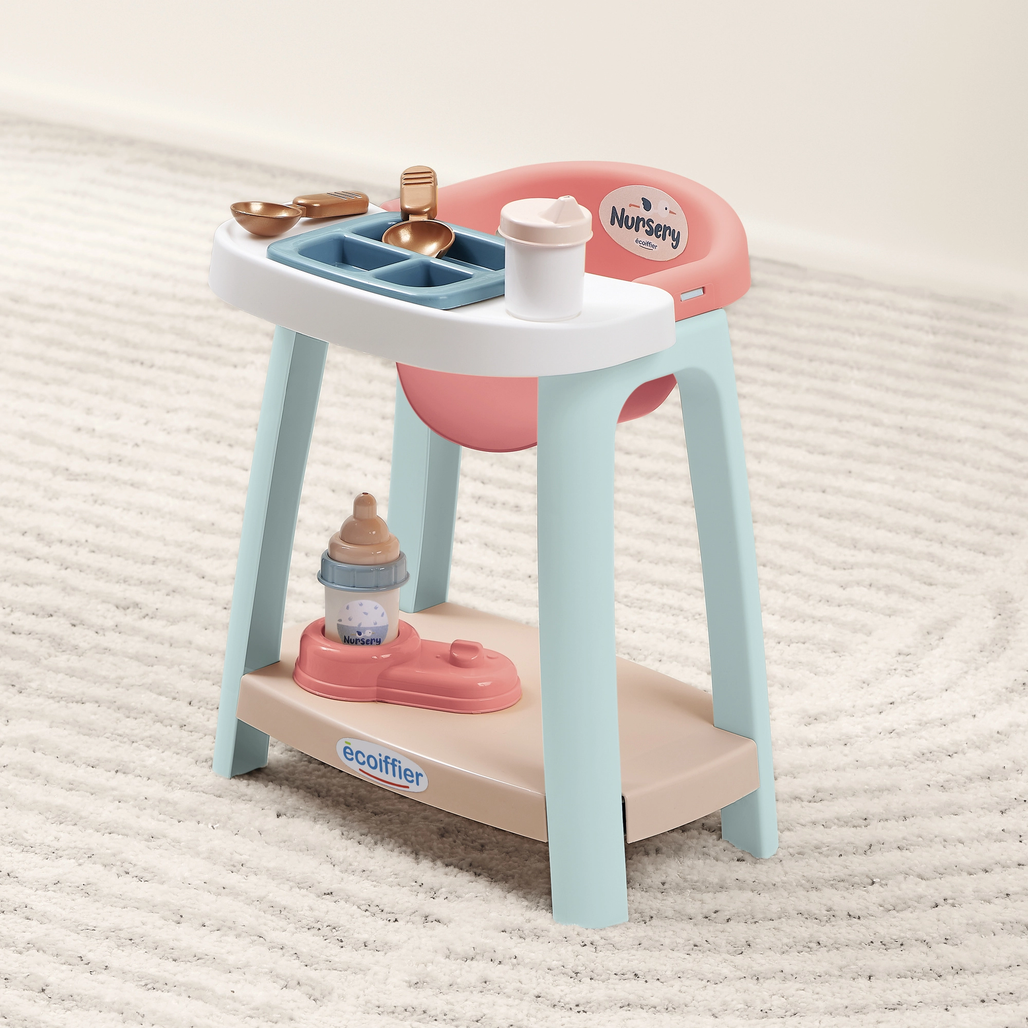 Den praktiske base og nederste hylde holder tilbehøret samlet. Pastelfarvet design passer ind i ethvert børneværelse.