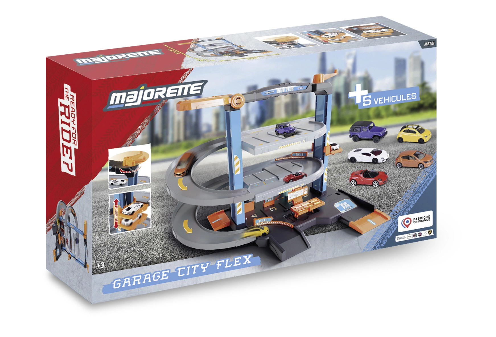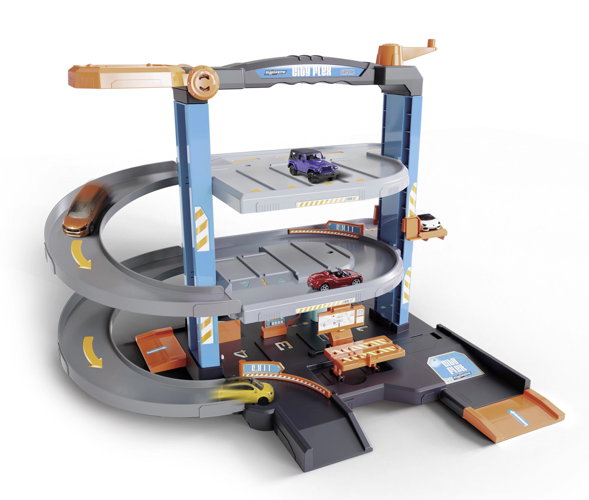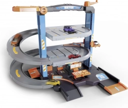 Dette detaljerede sæt skaber et komplet bymiljø for små bilister. Den treetagers garage med glidende ramper giver jævn ned- og opkørsel, den kurvbetjente elevator transporterer bilerne til hver etage, og værkstedet med tankstation understøtter realistiske legescenarier. Der medfølger 5 bybiler af typen “resorbil” til øjeblikkelig leg.
