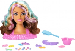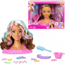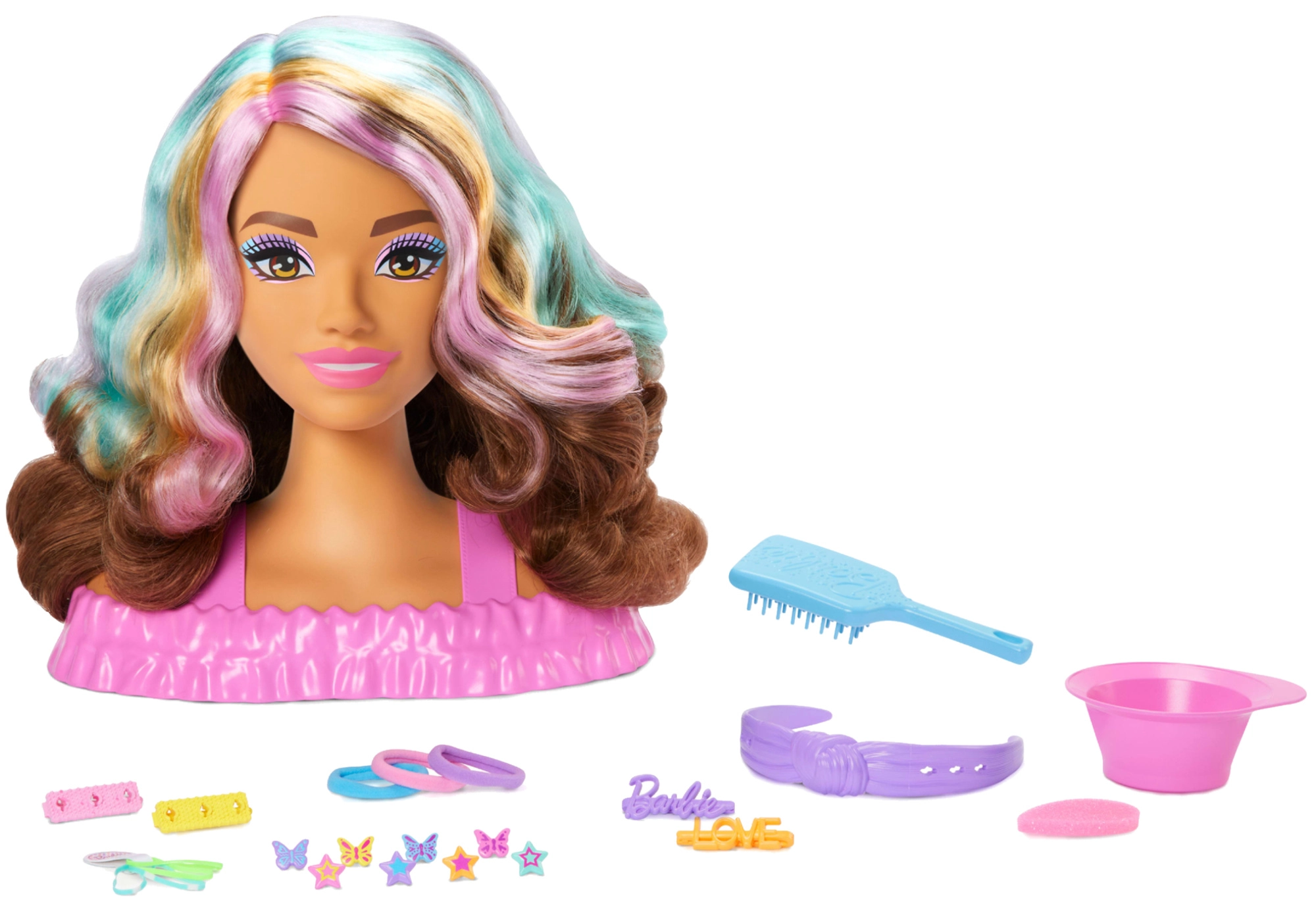 BARBIE frisørhoved giver børn uendelige muligheder for at skabe frisurer. Det lange brune hår med lyserøde, orange og turkise striber holder formen godt og indbyder til fletning, clipning og pynt. Sjov magi tilføjes med hårspænder og læber, der skifter farve ved brug af vand og svamp.