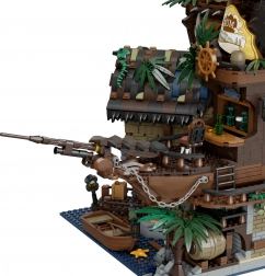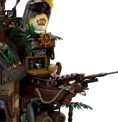 Væk havets historier til live med det rigt detaljerede byggesæt af et piratværtshus. Konstruktionen kombinerer rustikt træ, kæder, tønder, lanterner og kraniesymbol med korslagte knogler, og der er både sejl, flag samt funktionelle detaljer som døre, kran og en lille båd. Modellen begejstrer både børn og voksne byggere og bliver et markant indslag i samlingen.