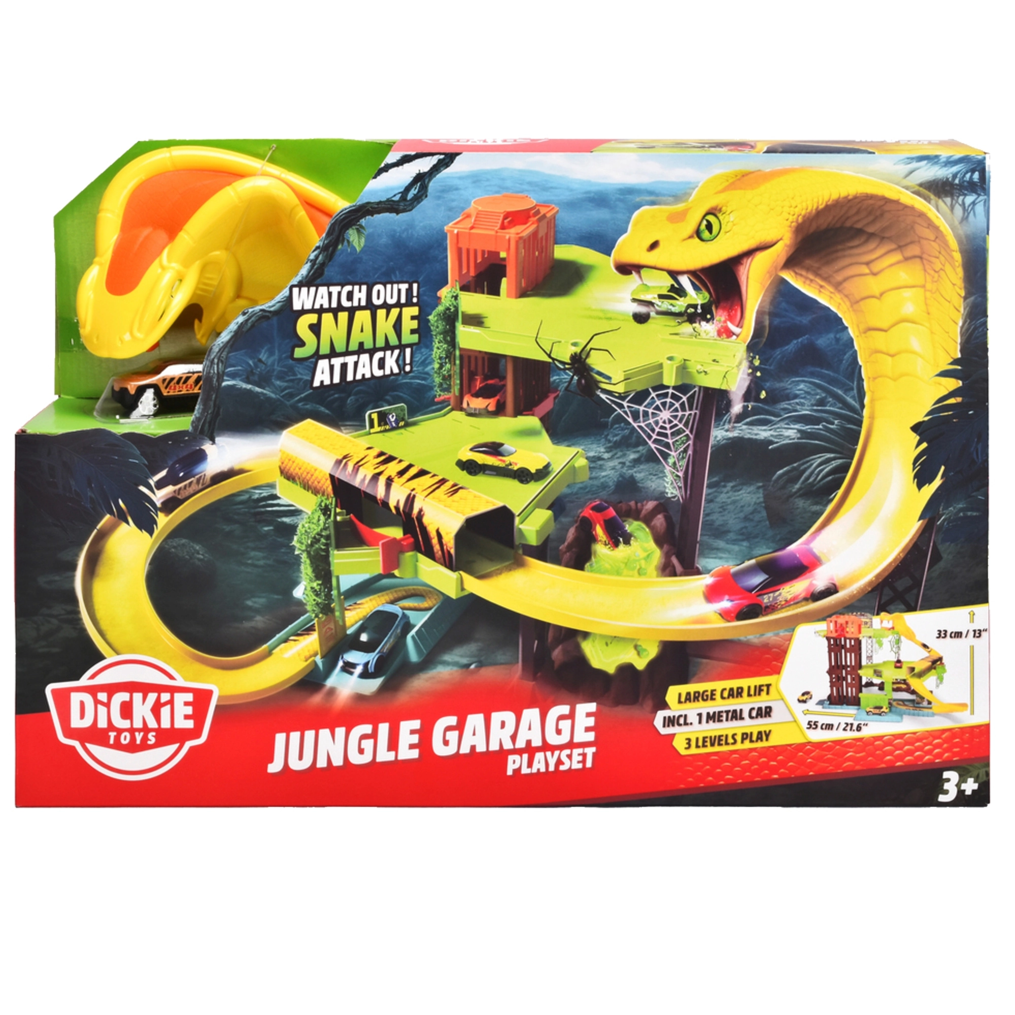 Tag på en spændende tur gennem junglen og udforsk alle tre niveauer af banen, hvor en kæmpeslange lurer. Dickie Toys racerbane er designet til dynamisk leg med glatte nedkørsler og opkørsler, og takket være den bevægelige elevator kan du nemt flytte den lille bil mellem etagerne.