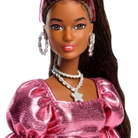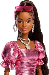 BARBIE Deluxe Style dukken skiller sig ud med et moderne look og materialer af høj kvalitet. Den glansfulde koralfarvede kjole med voluminøst skørt, pink briller, hoops-øreringe, lagdelt halskæde og elegant håndtaske udgør et perfekt outfit til både catwalken og hverdagens historier. De lange mørke hår i en høj hestehale understreger det trendy udtryk.
